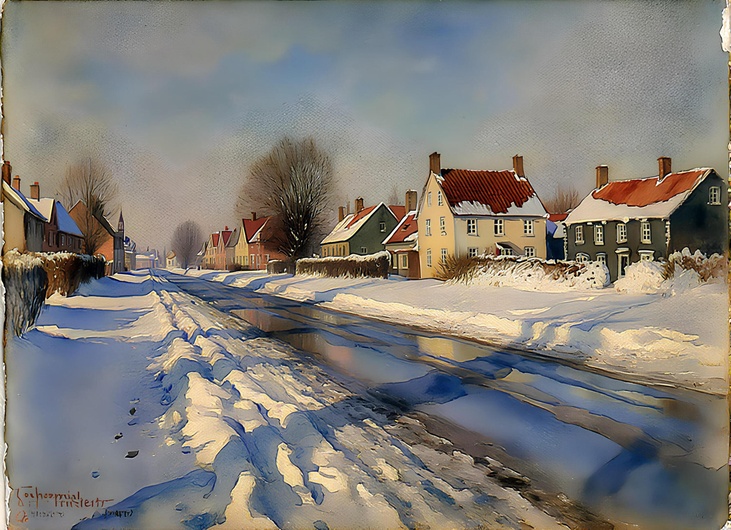 冬の朝、よく晴れて、前日に降った雪が朝日に輝いています。