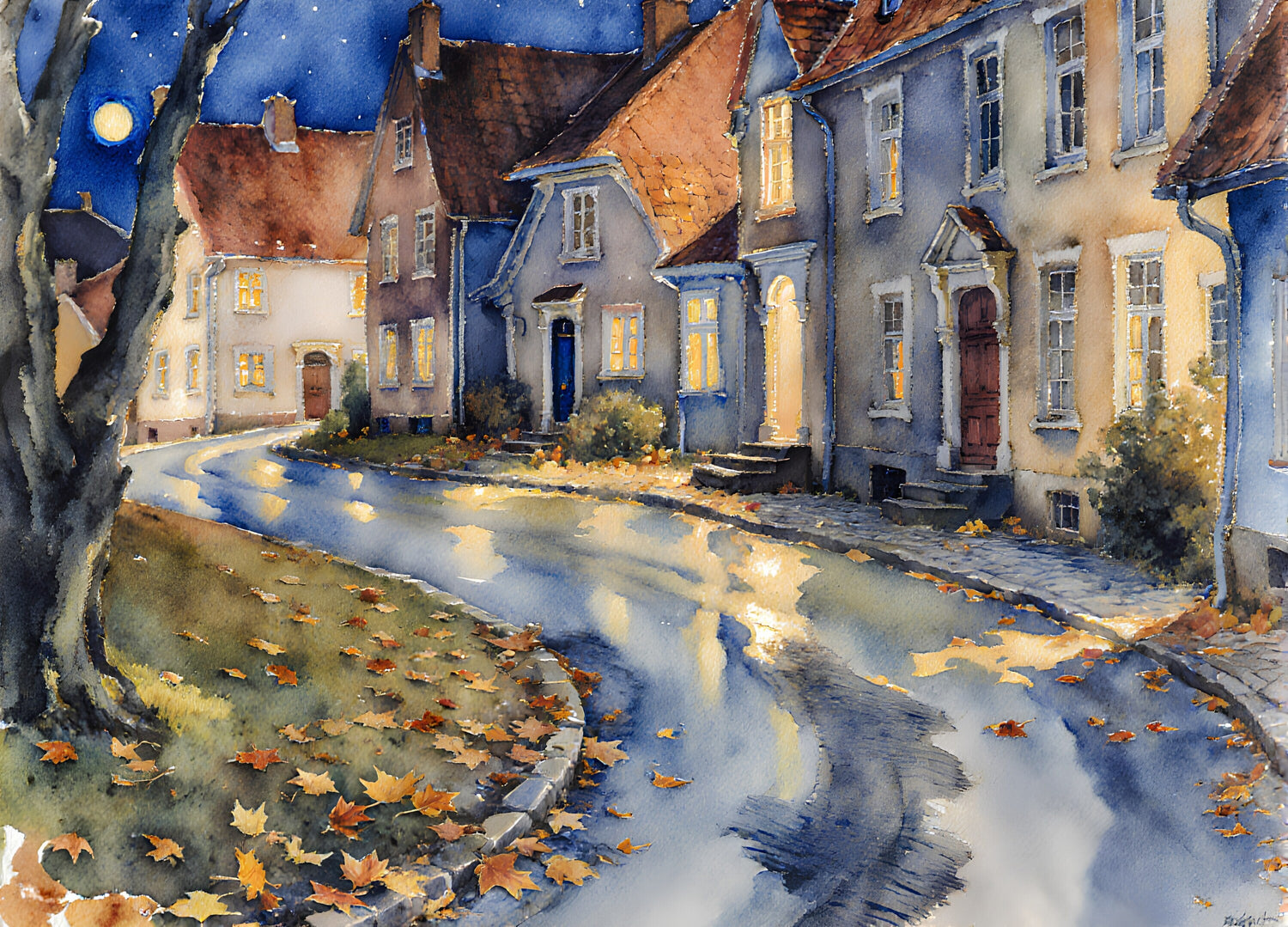 秋の夜、家々に明かりが灯り、道を照らしています。