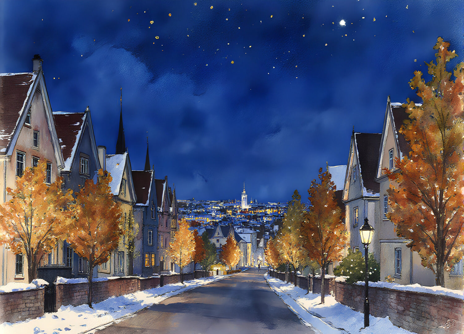 晩秋の北欧の街の夜です。少し雪が積もっています。