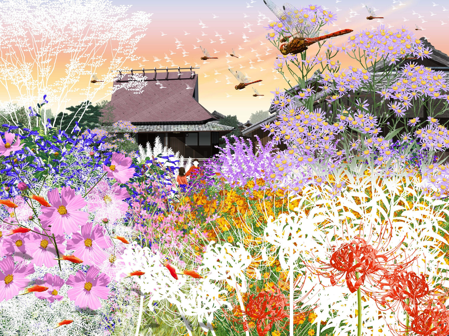 コスモス、セージ、シオン、キバナコスモス、彼岸花等の秋の花々が共演する、アキアカネの群れが飛ぶ夕焼けの農家の庭に姉妹が遊ぶ。