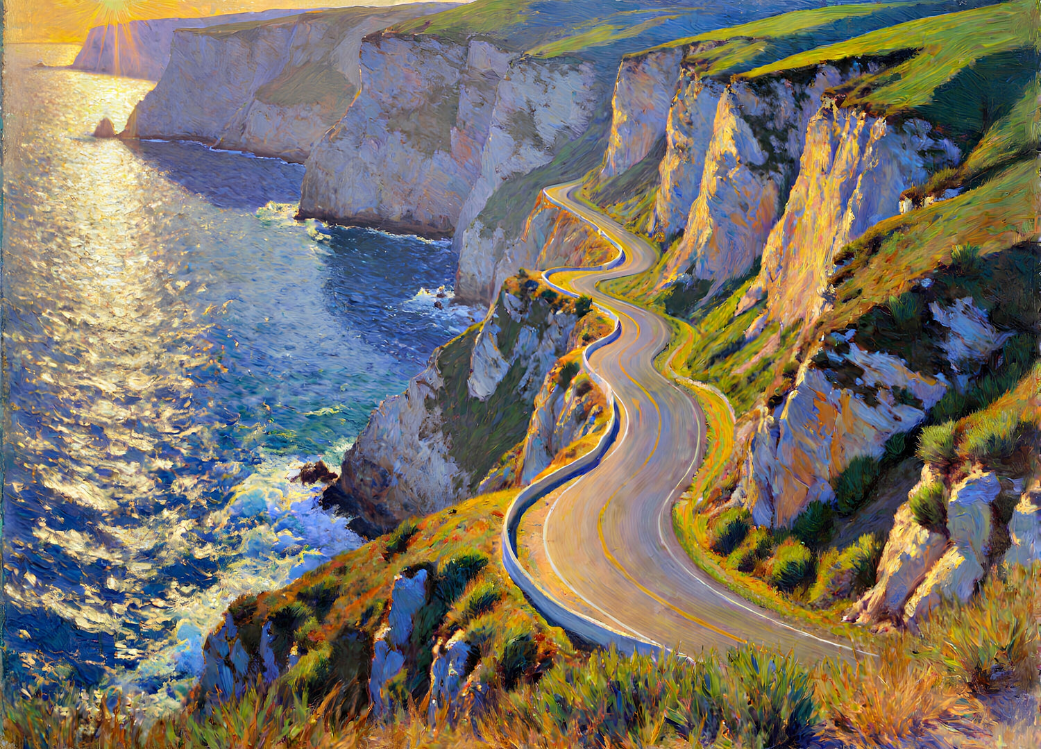 午後の陽に照らされた海岸の道