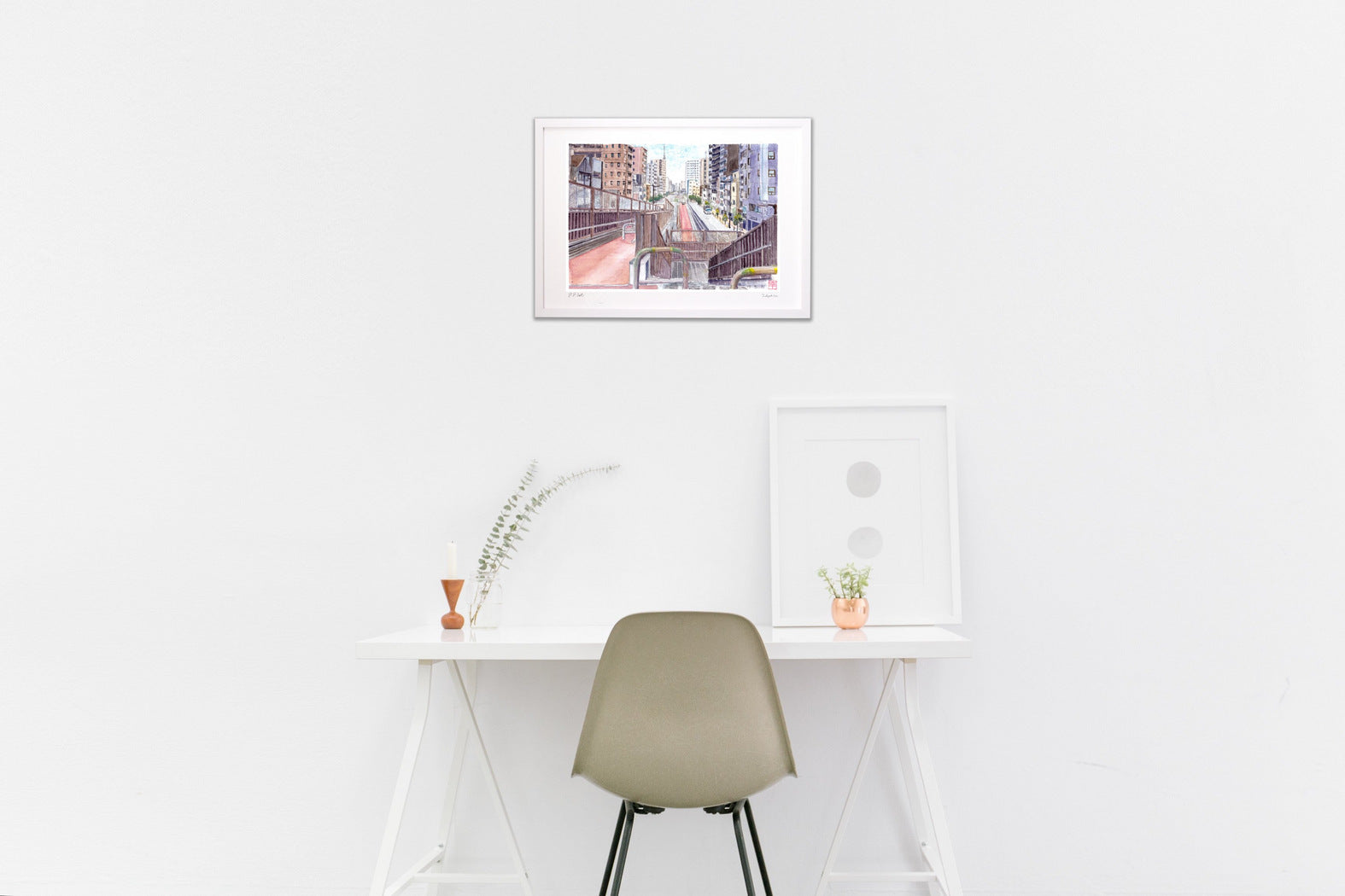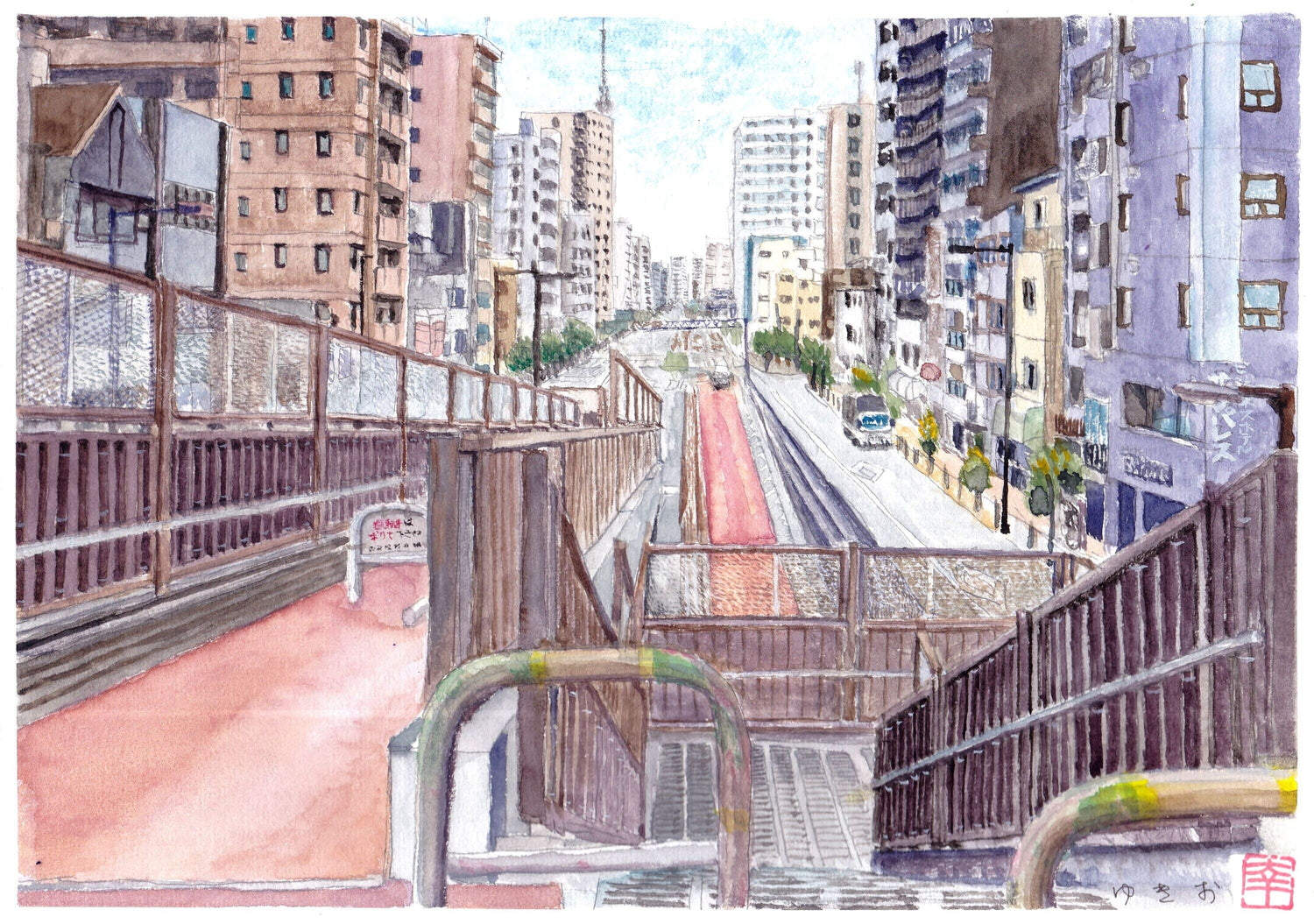 水彩画 南千住駅南口の歩道橋の上から見た所。