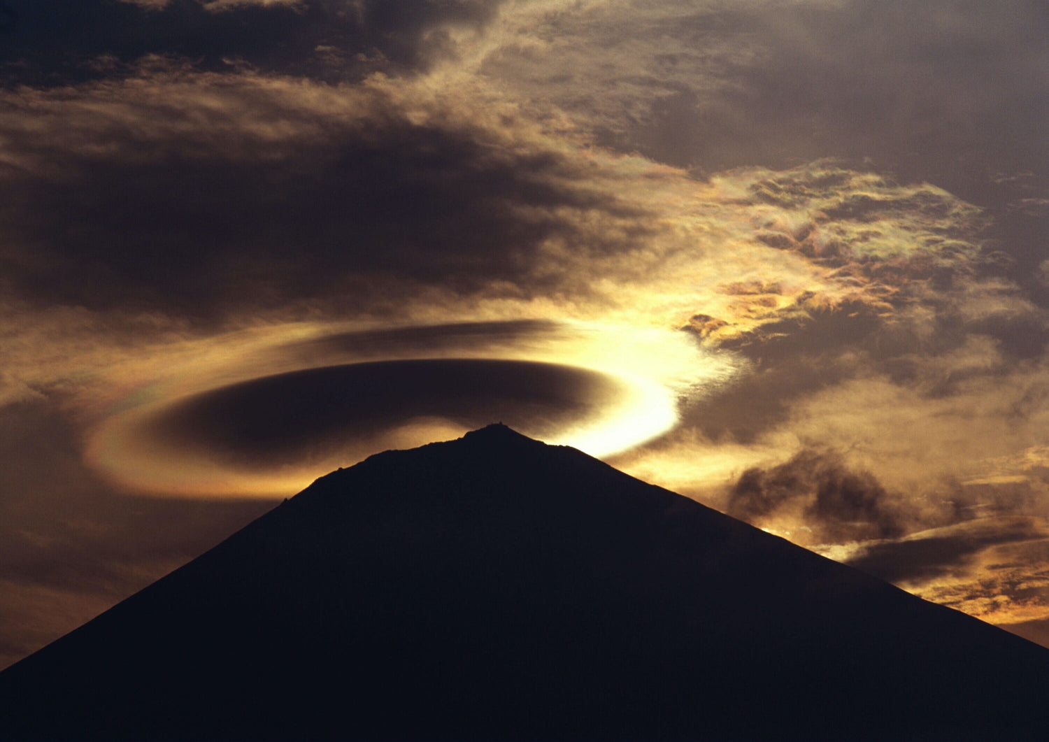 朝霧高原からの撮影 富士山の風下にできる変わった吊るし雲に朝日が当たり 幻想的な光景を見せてくれた。