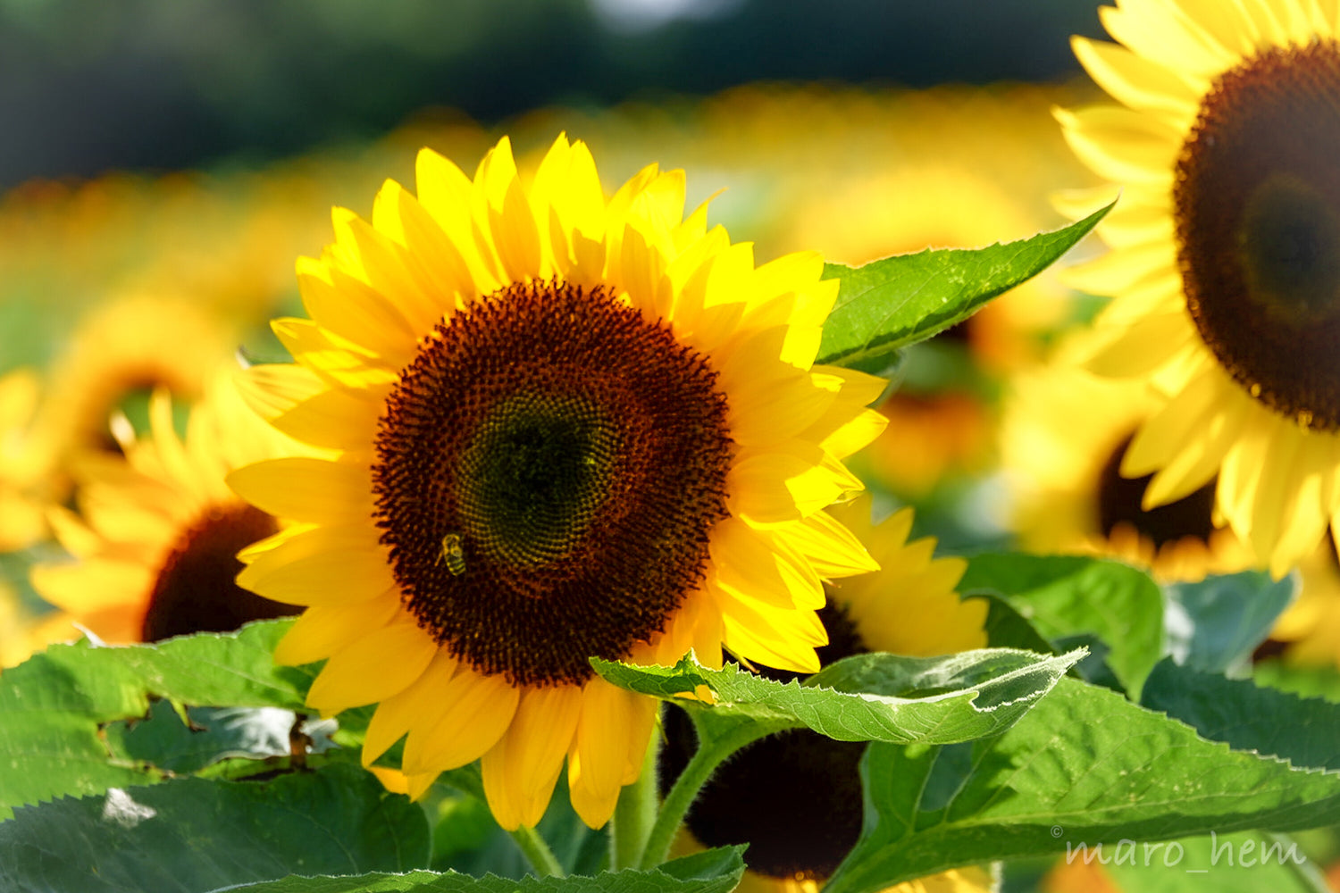 凛々しくも優しく、堂々と咲き誇る向日葵に蜜蜂も寄り添い休んでいるのか、とても時間の流れが緩やかに感じる瞬間を撮影しました。