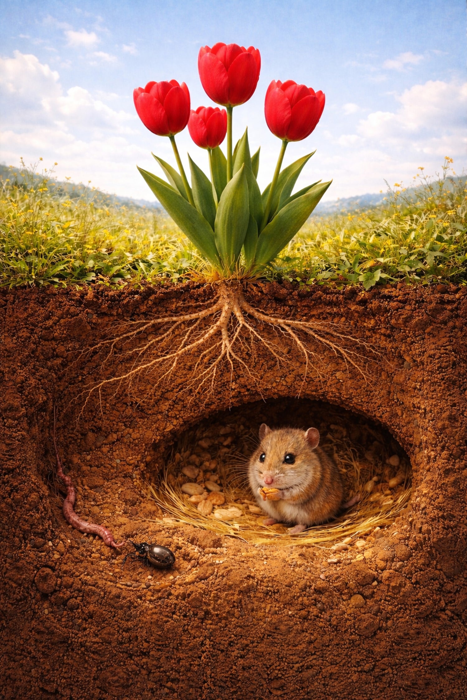 鮮やかな赤いチューリップが咲く地上。その下には、根が大地に広がり、小さな住人がぬくもりのある巣で暮らしています。