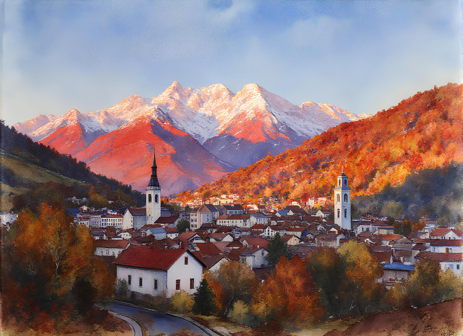 山に囲まれた地方都市の秋の夕暮れ時の風景です。