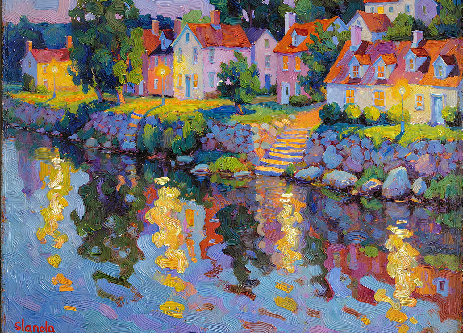 住宅の暖かい照明が川に反射している。