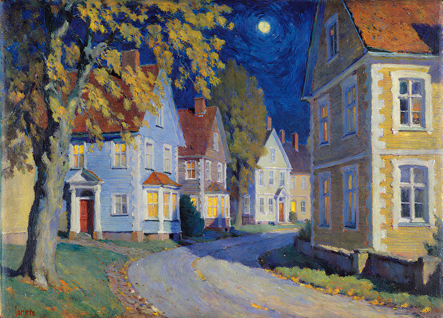 月が出て、曲がりくねった道沿いの家を照らしている。