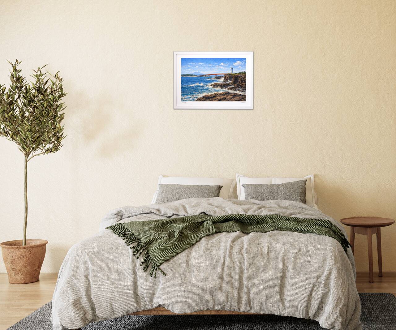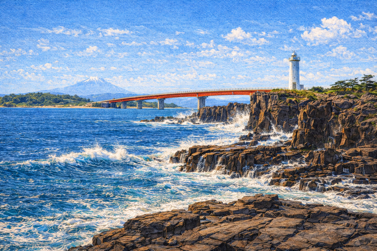 黒褐色の岩肌に白波が砕け、海の力強さが画面全体に響く城ヶ島の海岸線。岬には白い灯台が静かに立ち、空を横切るように伸びる赤い大橋が、景色に鮮やかなアクセントを添えます。遠景に浮かぶ富士山が構図を引き締め、自然のスケールと“日本の海”らしい清涼感を同時に感じられる一枚に仕上げました。