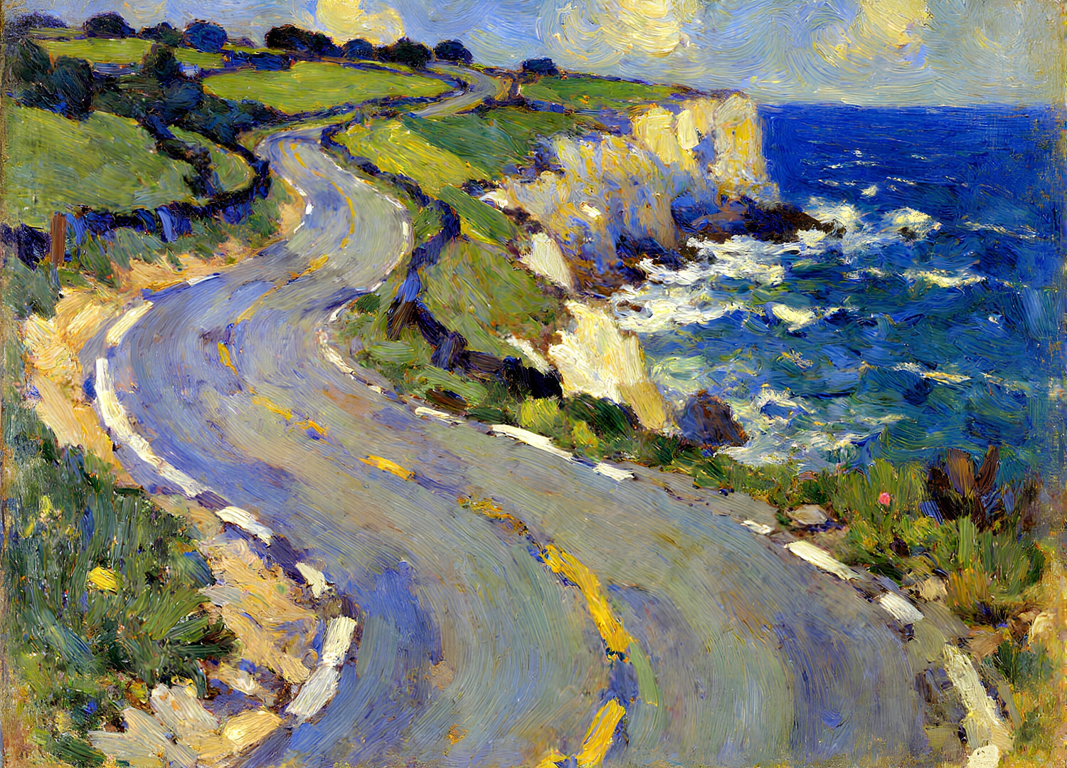夏の明るい海へと続く曲がりくねった道