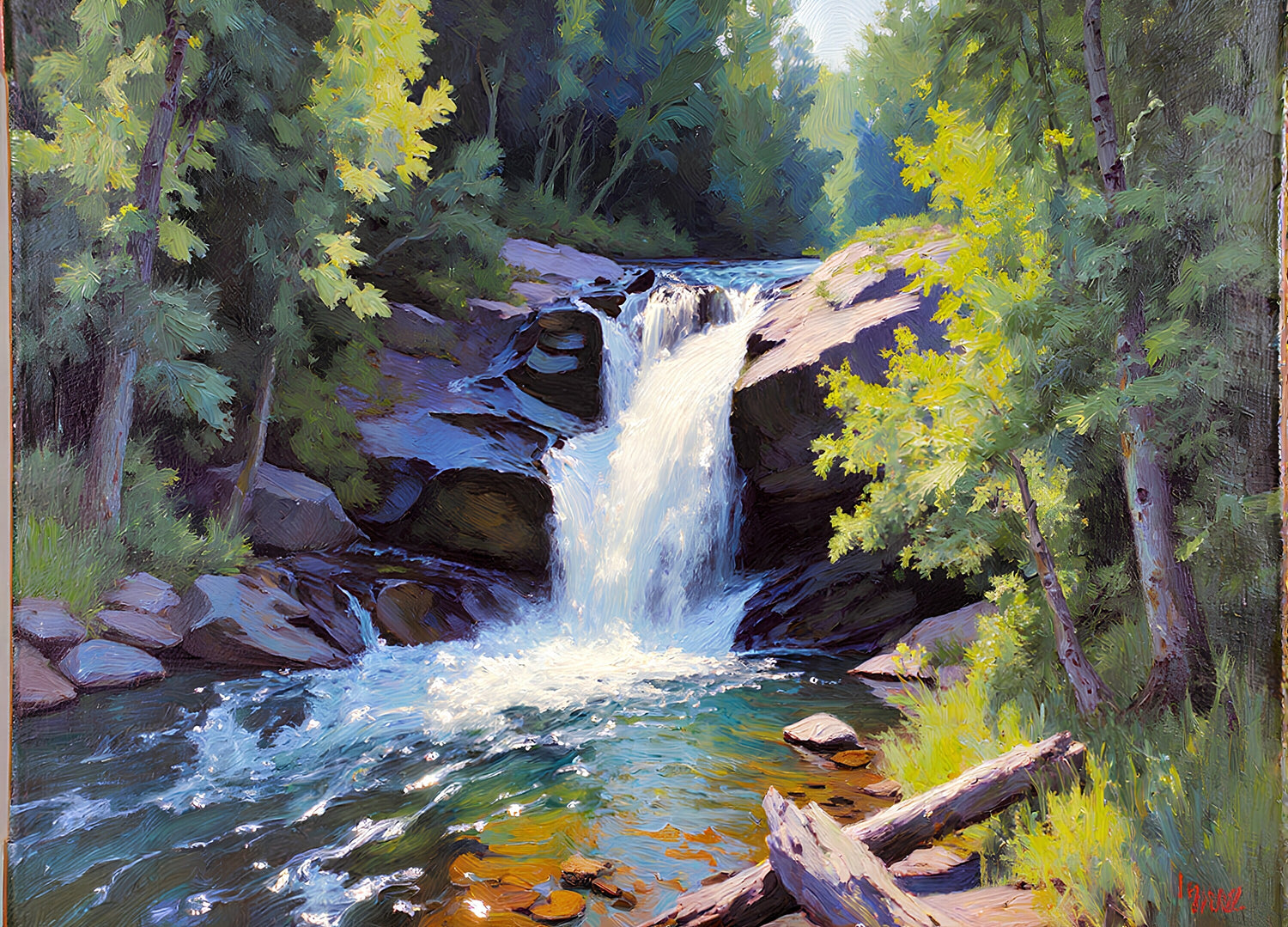 滝があり、日が当たって輝いている。
