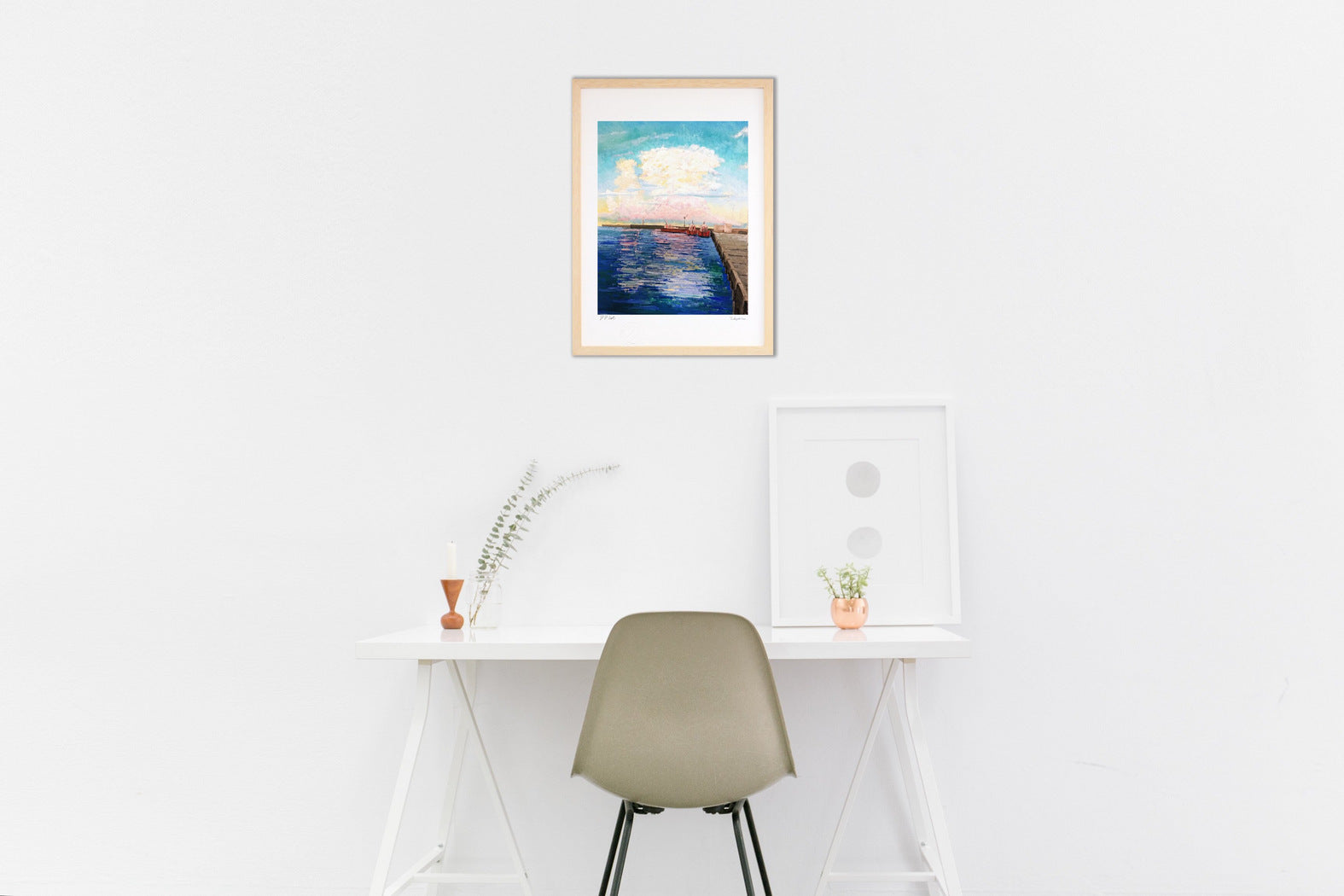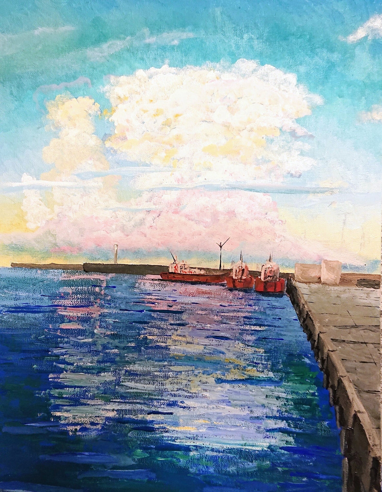 夏も終わりが近づいた昼下がり、港には昼下がりの少し朱色に染まりかけた積乱雲が最後の姿を見せています。少しけだるい昼下がりを描きました。