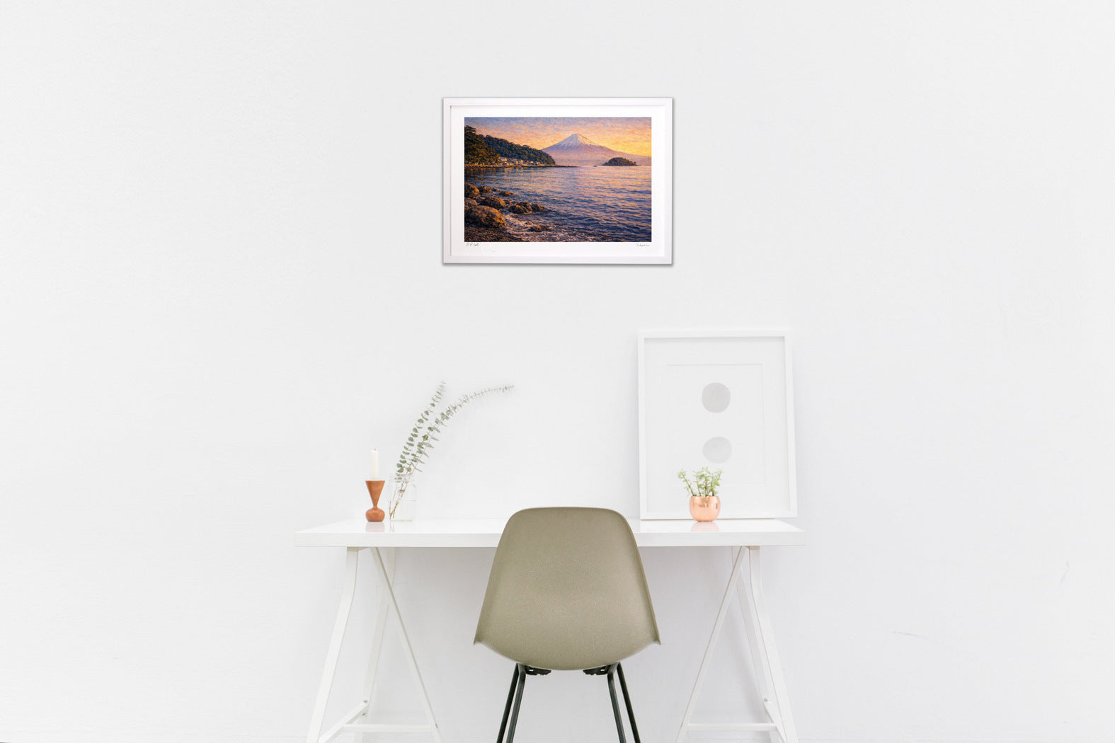 制作ではデジタル技術を取り入れつつ、構図・空気感・余白のバランスを重視し、絵画としての完成度を最優先に一枚ずつ丁寧に仕上げています。