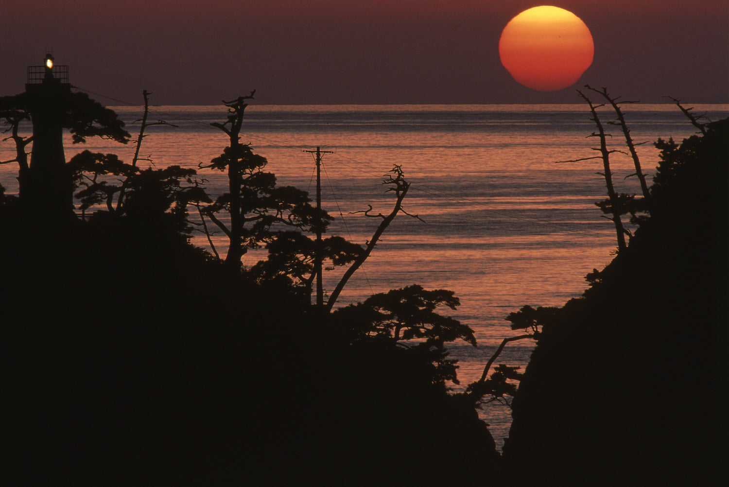 灯台を含めた前景と夕日の落ちる位置を計算して構図を決定、条件の良い日を選んで撮影。