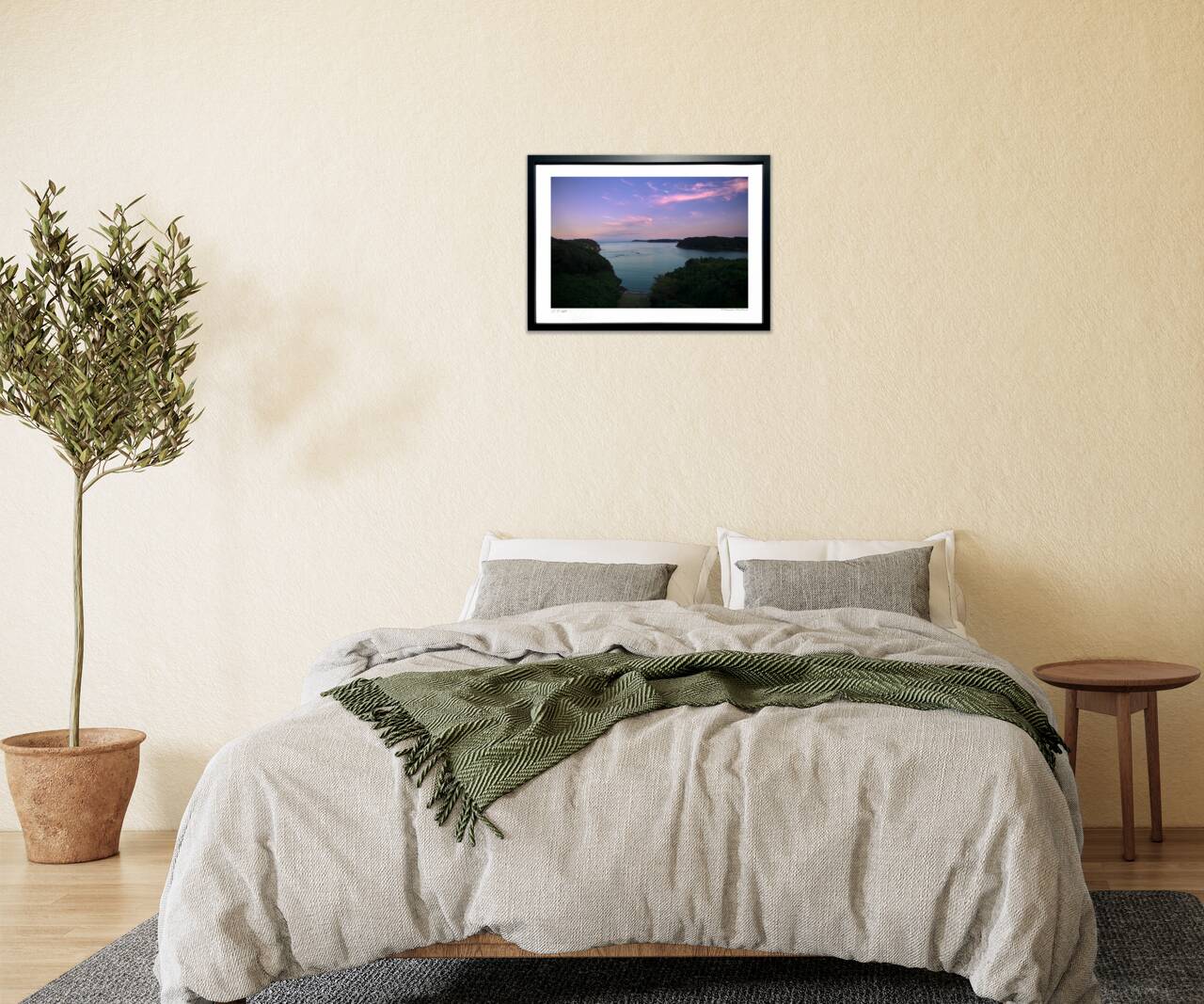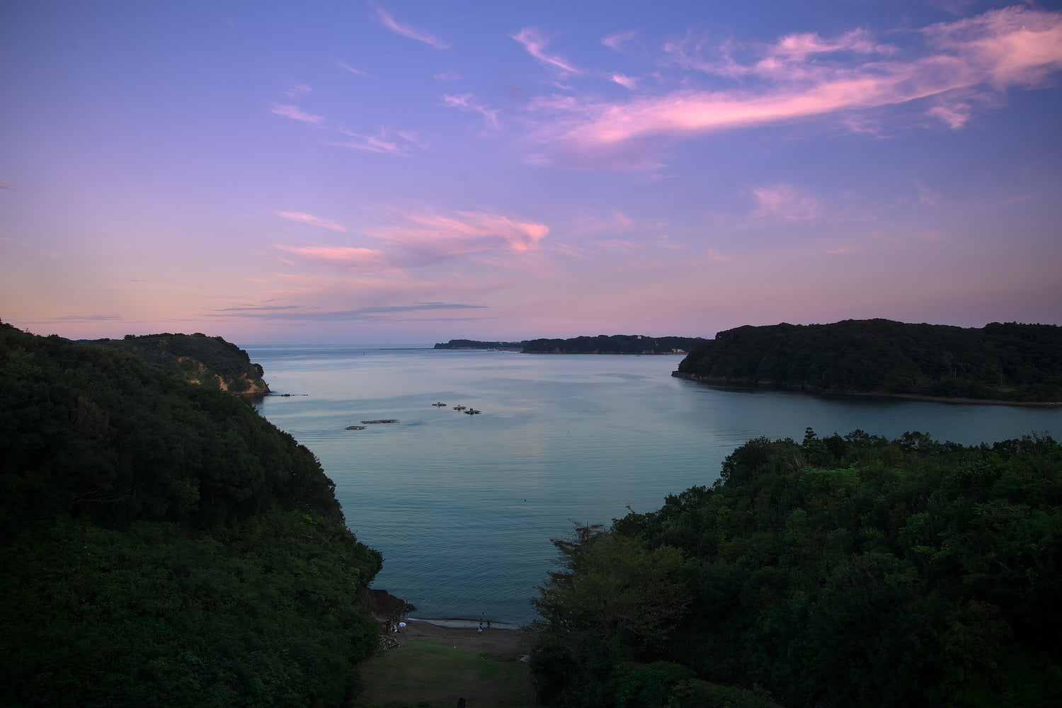 両岸の緑豊かな岬がフレームを彩り、自然が作り出す調和の美を感じさせます。
