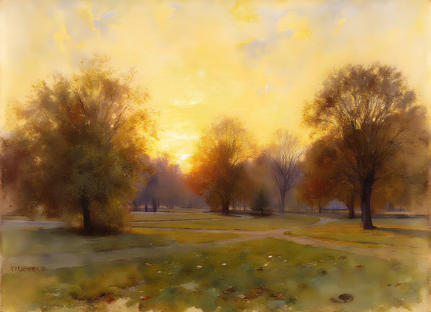 晩秋の公園の風景です。木々は色づき、空は黄色に染まっています。