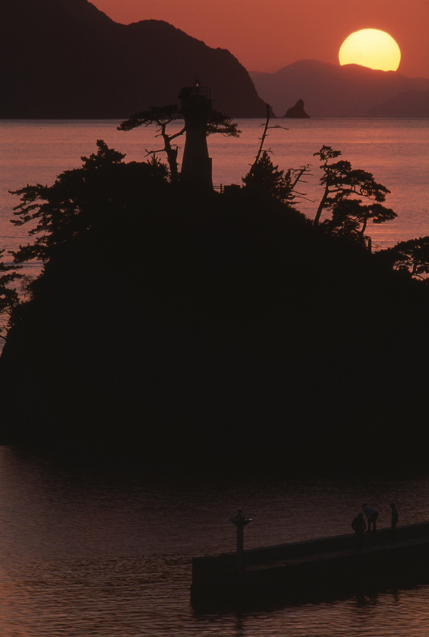 夕日と灯台、突堤の人影を取り入れて、夕暮れの港の風景として構成。