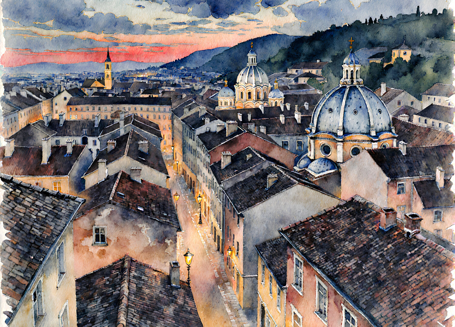 街の屋根やドーム屋根は、薄れゆく夕焼け空、濃紺と赤に染まり、その背景に、暗く質感のある形を浮かび上がらせています。