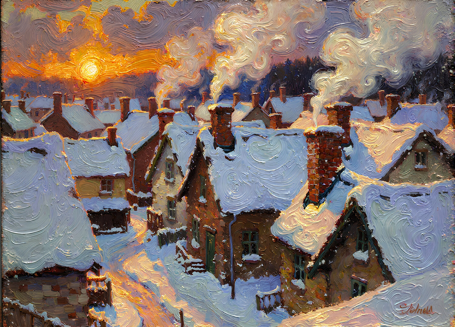 煙突からは煙が柔らかく渦を巻くように立ち上り、雪は沈む夕日の深い琥珀色を映し出しています。