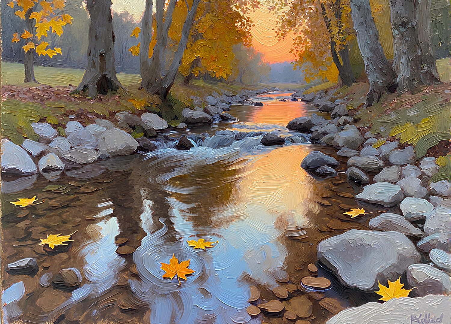 ゆっくりと流れる水面に映るオレンジの落ち着いた空