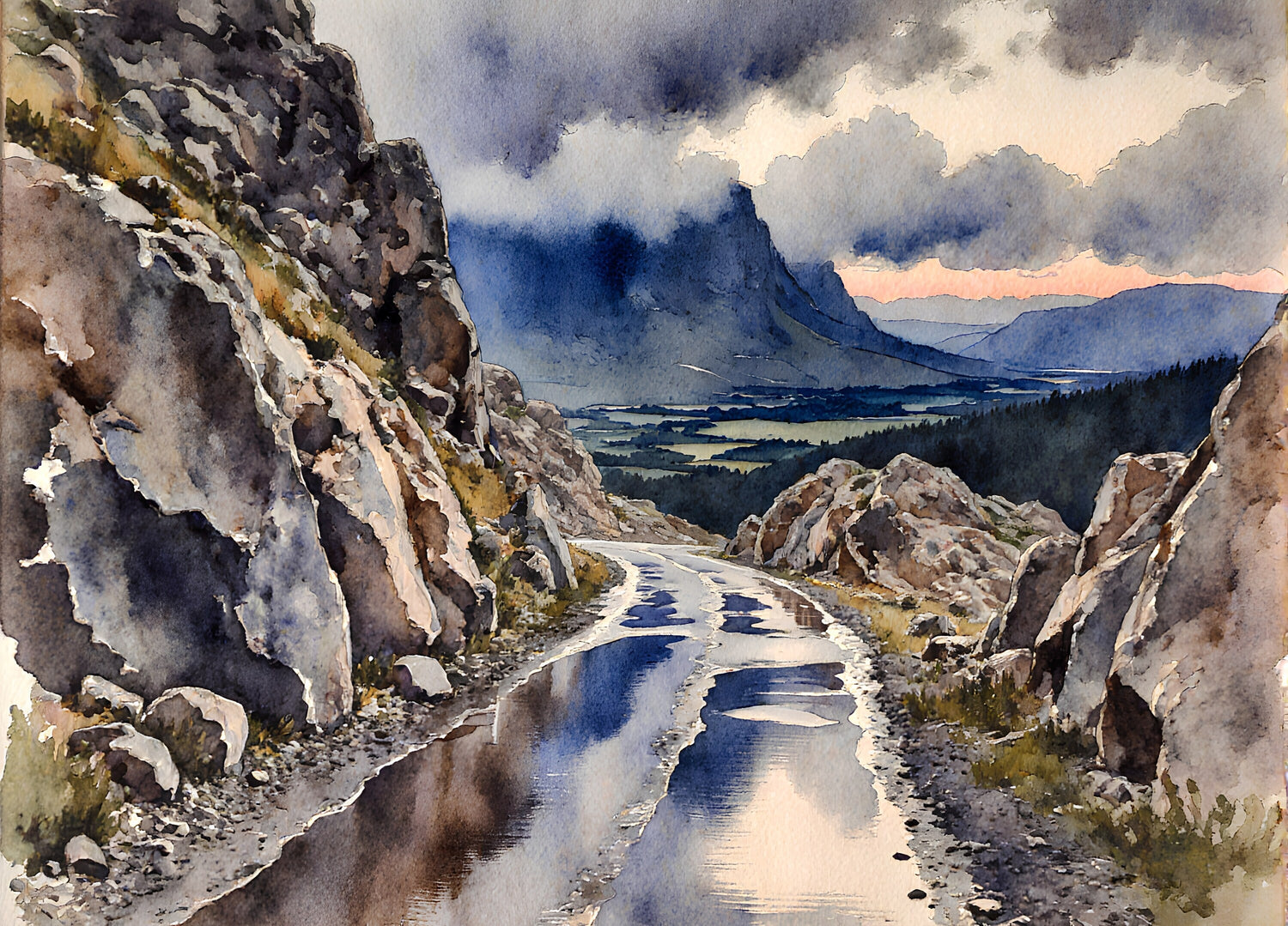 夕暮れ時の雨上がりの岩だらけの峠