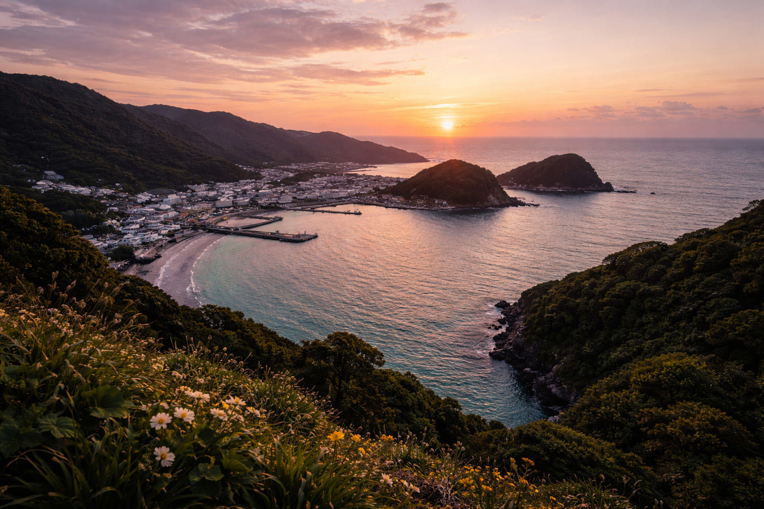 高台から見下ろす湾は、夕日の余韻に包まれ、