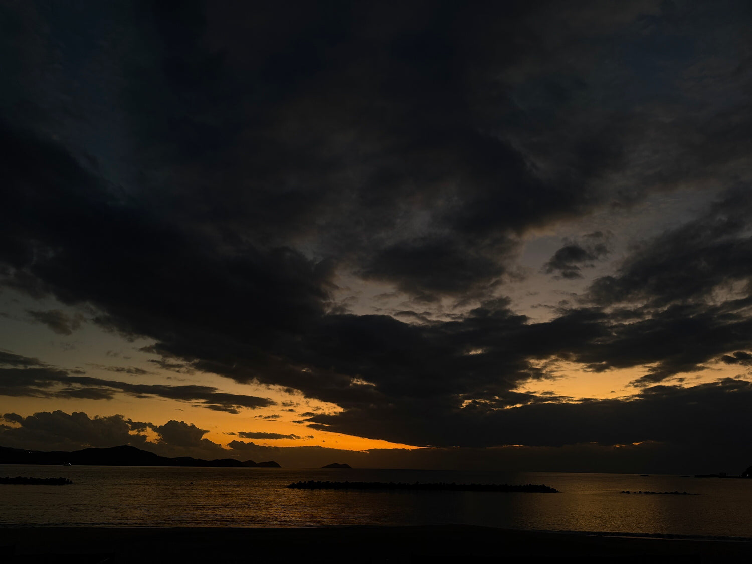 夕焼けのオレンジの光が暗い中海に反射して輝いている。暗闇の中でも光が差しています。どんな暗闇の中でも光が差して導いてくれると思います。