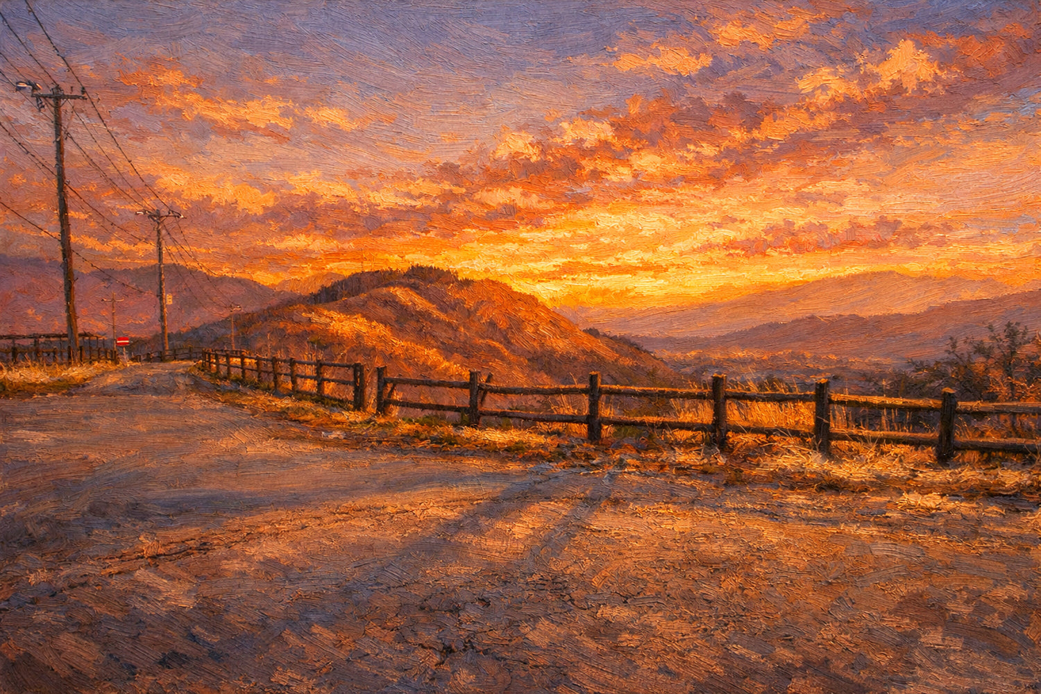 夕焼けに照らされた道が、静かに山の向こうへ続いていく。