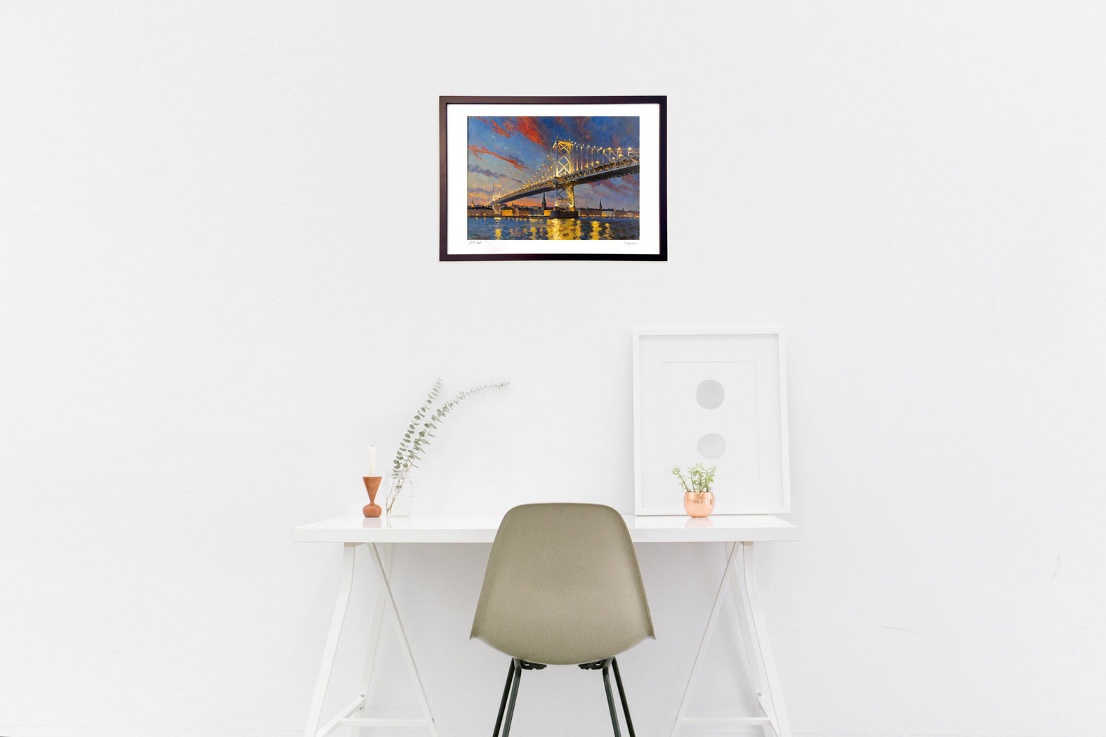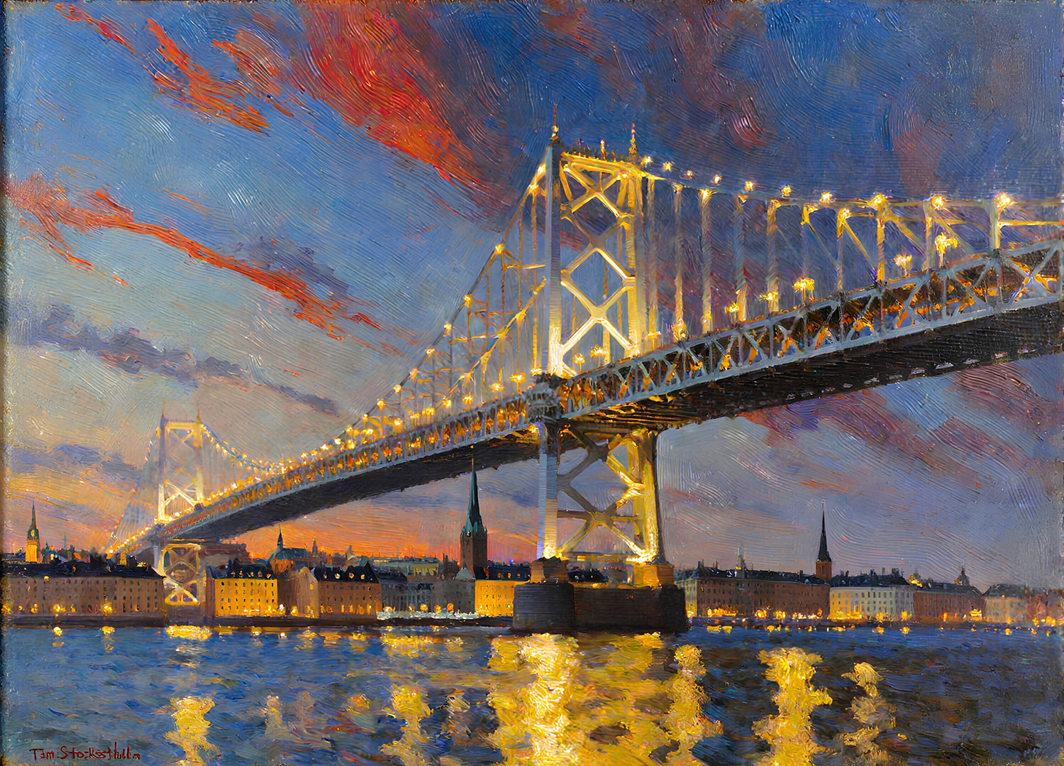 日暮れの最後の光が水面と橋の鉄骨に金色の輝きを放っている。