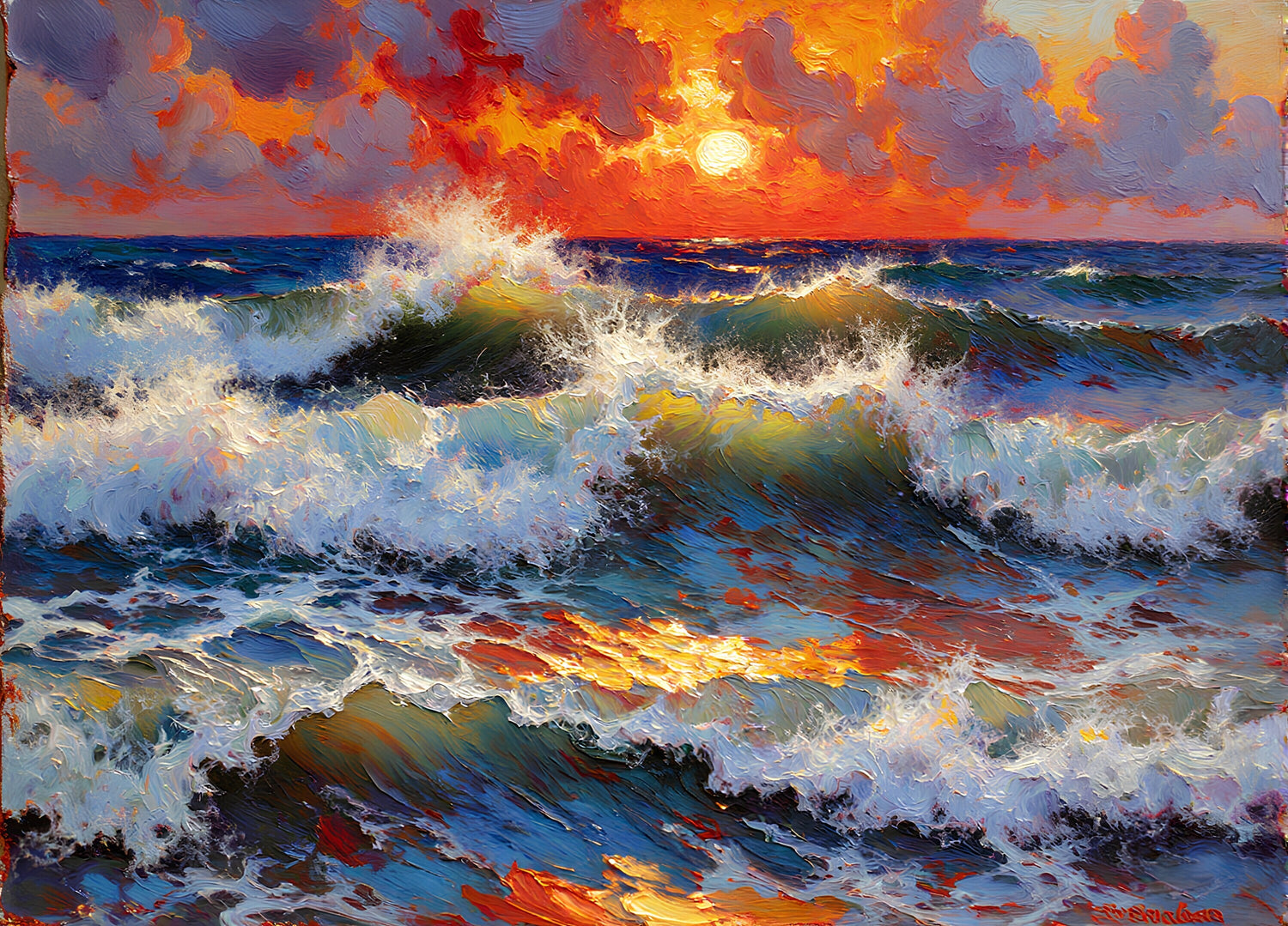 激しく打ち寄せる波、深い青色の海と力強い赤橙色で精細に描かれた空