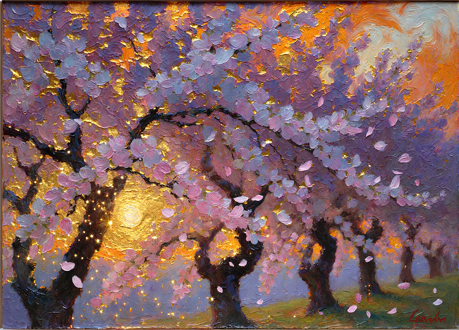 空気は輝く光の粒子と舞い散る花びらで満たされ、まるで空気全体が振動しているかのようです。