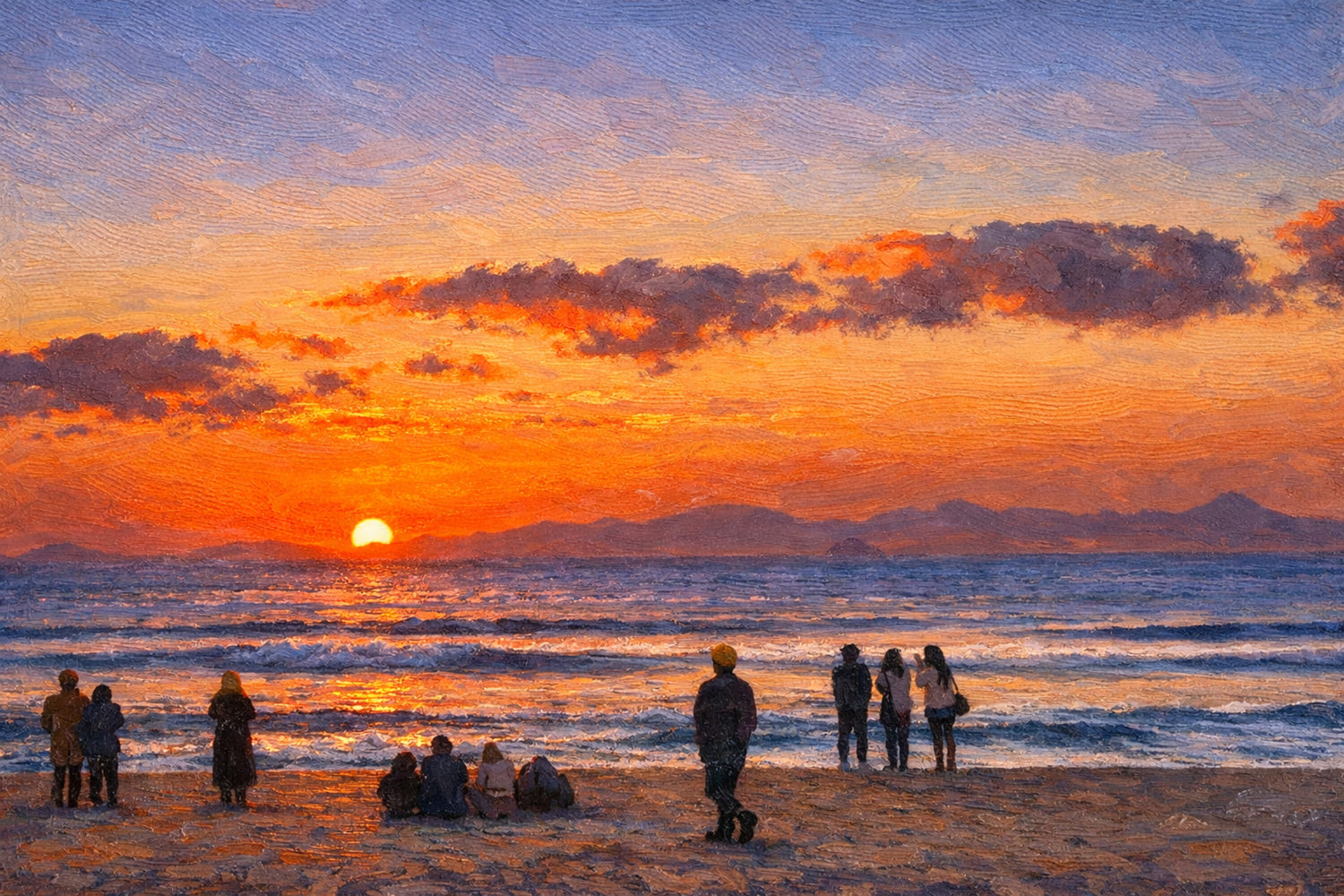 夕日が水平線に沈む瞬間、海と空が深い橙に染まり、浜辺に集う人々が静かにその光景を見守る情景を描いた作品です。