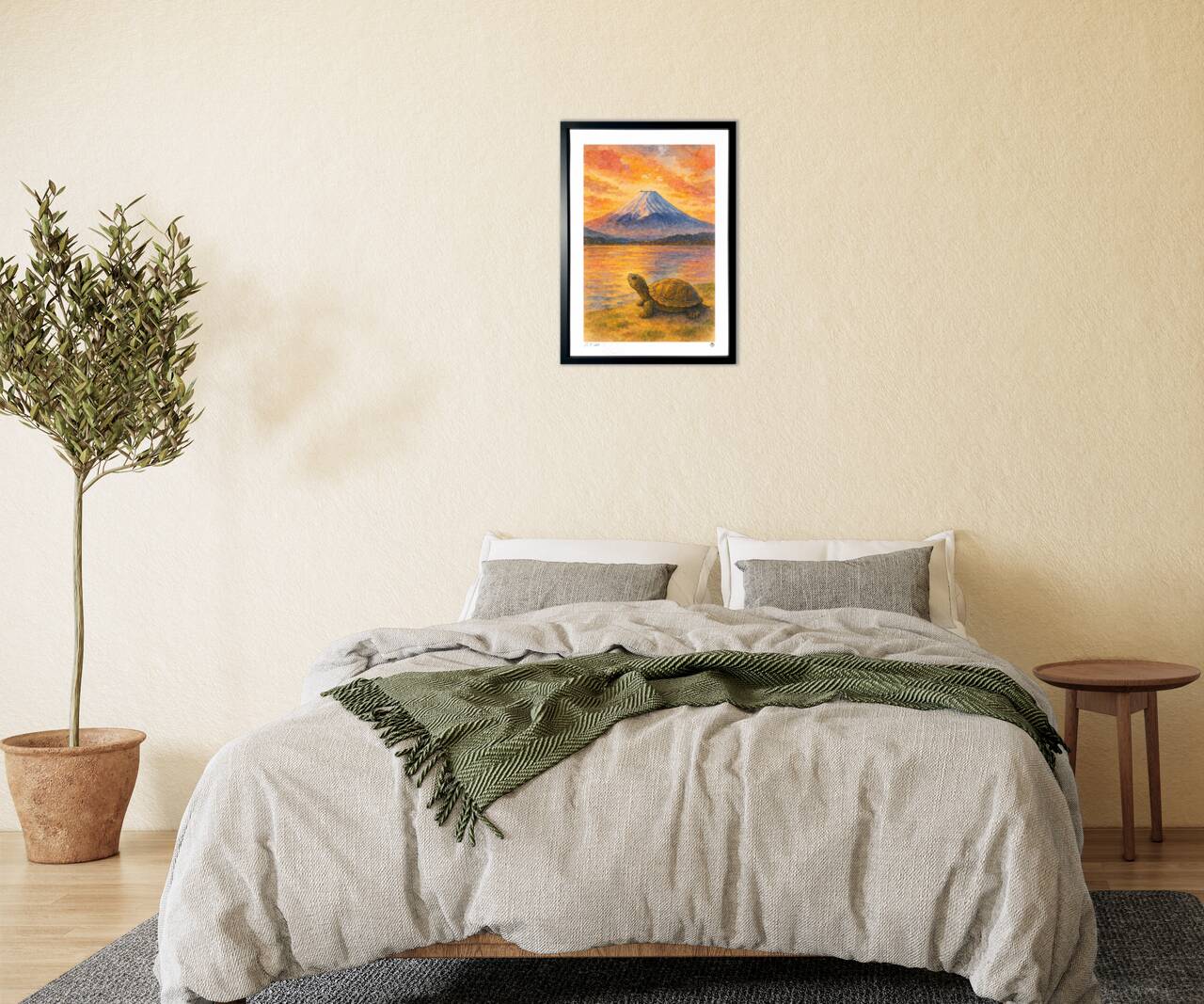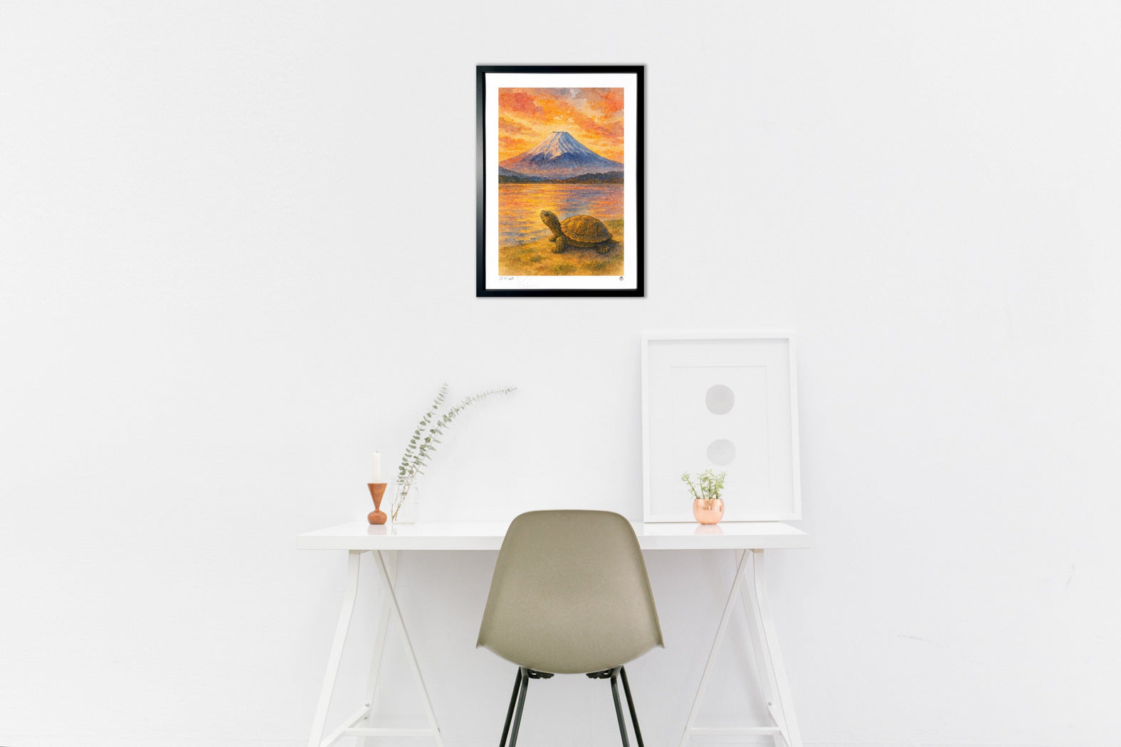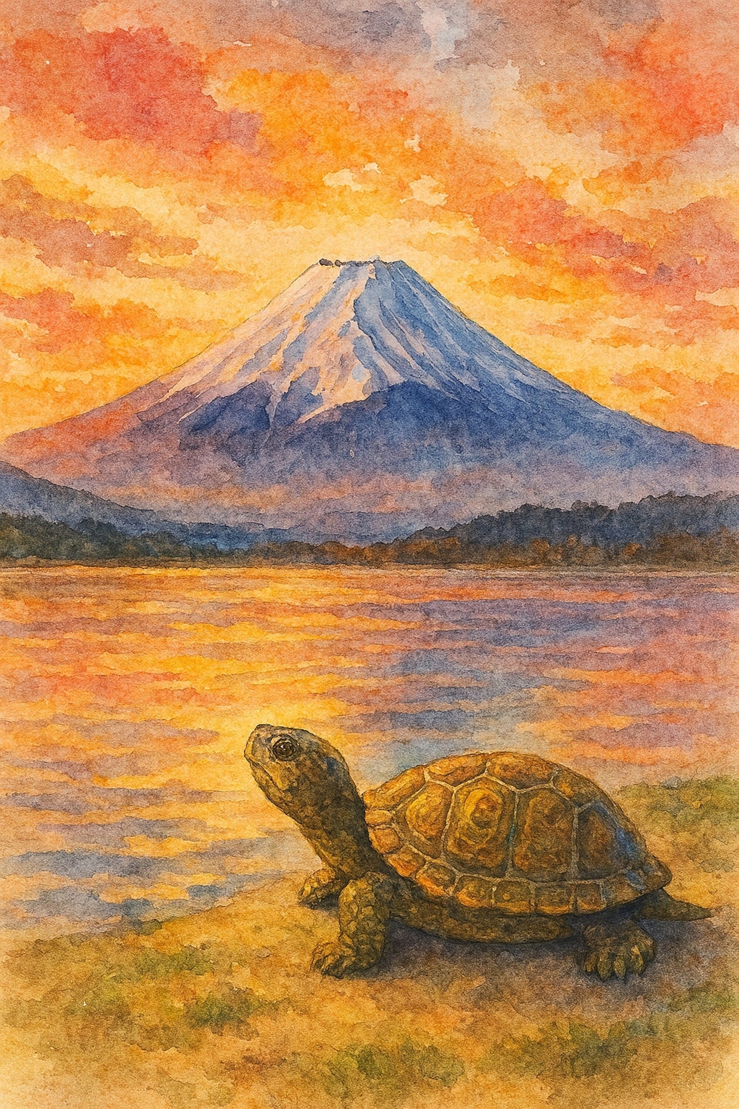 夕焼けに染まる富士山を背景に、静かな浜辺でカメが水面を見つめる情景。穏やかな光と自然の静けさが心を癒す一枚です。