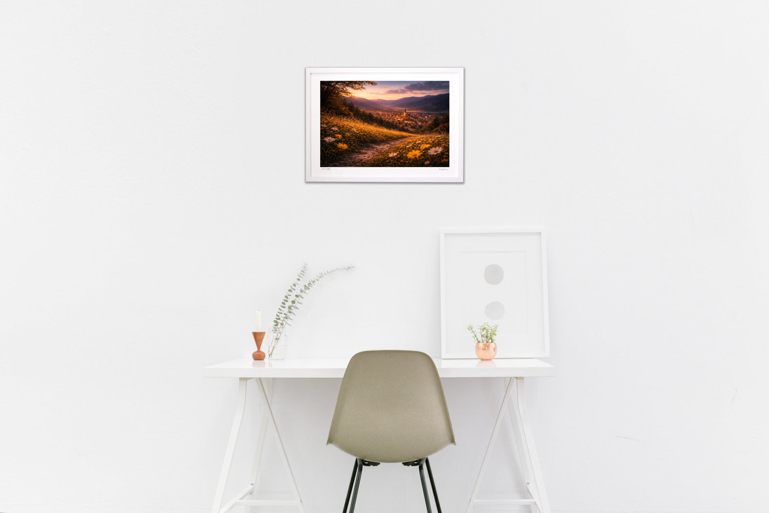 夕焼けに染まる空の下、花咲く丘の小道から見下ろす谷あいの町。