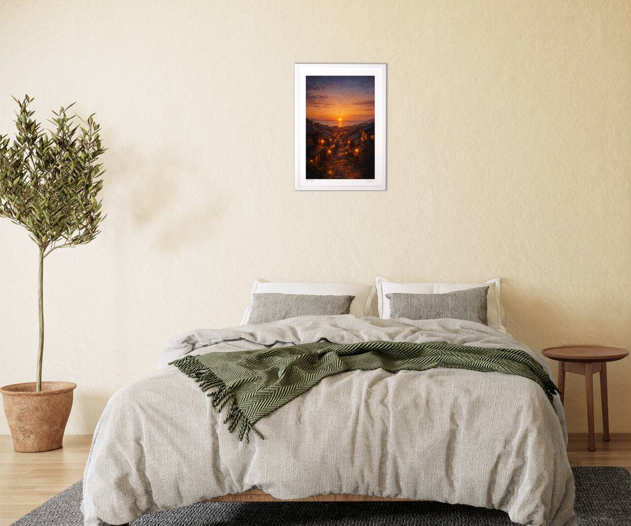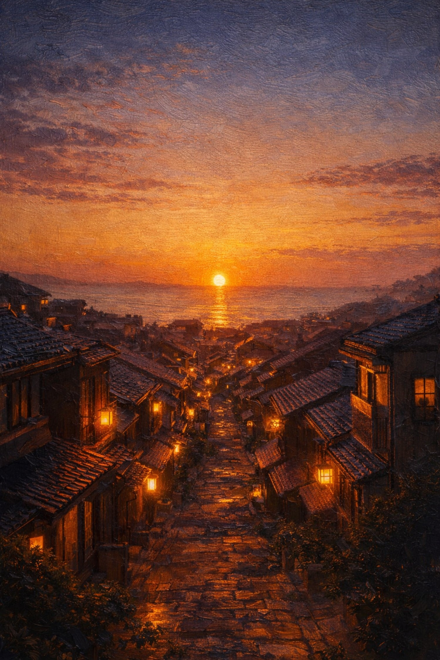 空のオレンジから深い青へのグラデーション、屋根や路地に落ちる柔らかな陰影、そして静かな反射が、懐かしさと安らぎを同時に呼び起こします。