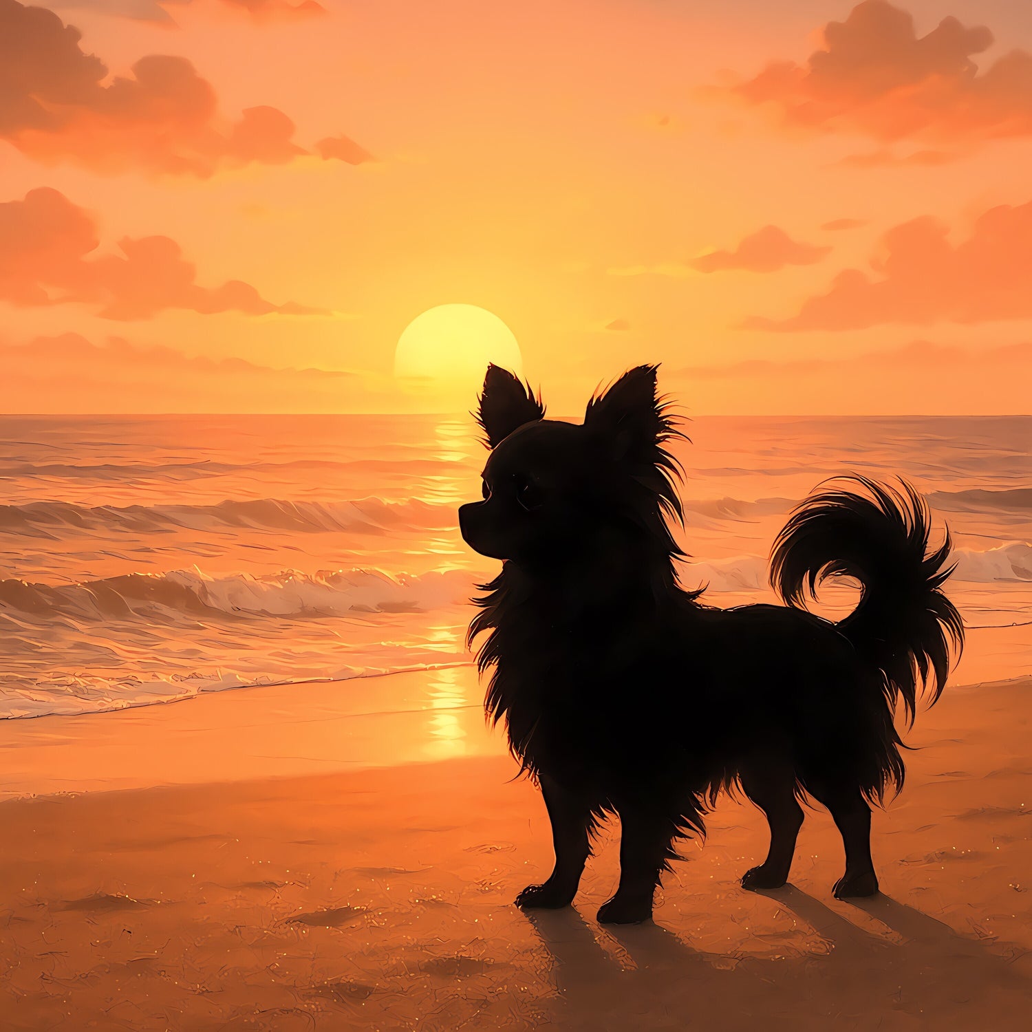 お散歩に来て帰ろうとしたチワワちゃんが、空がオレンジ色に変わっていくのを不思議そうに見つめてる。