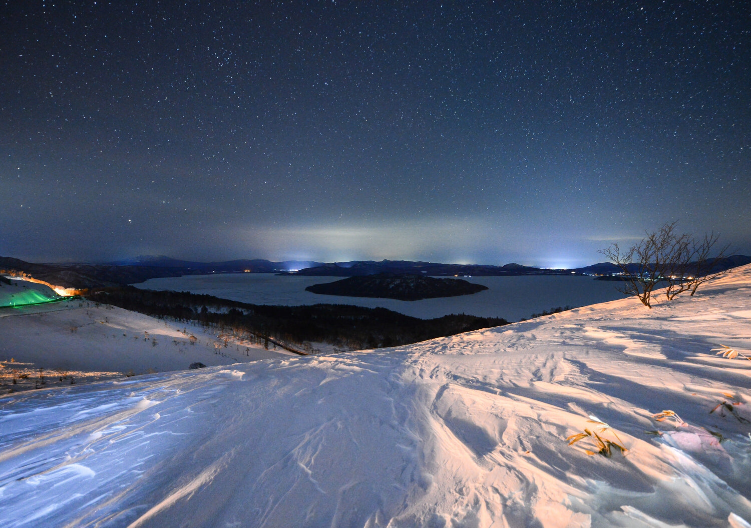 眼下には屈斜路湖が広がり、夜空には星がキラキラ光ります。