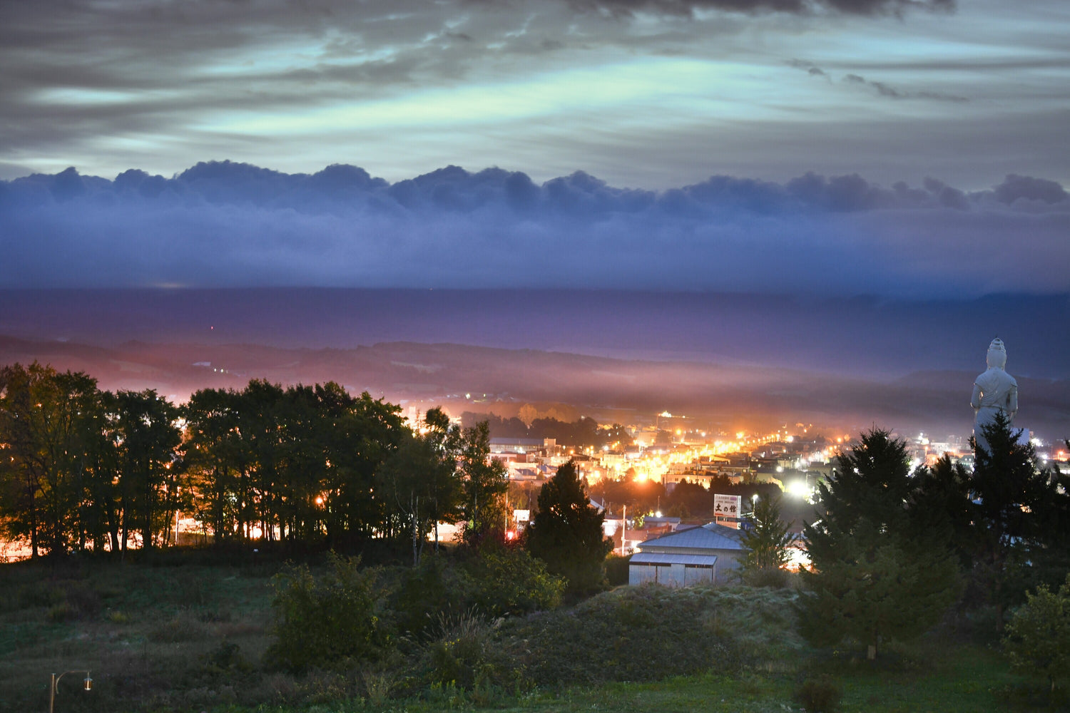 十勝岳連峰から降りてくる雲海に包まれそうな夜明け前の景色でした