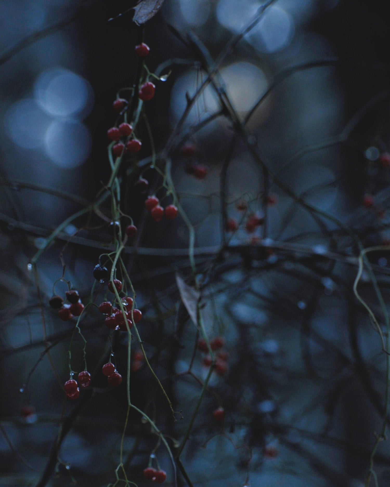 まだ眠りから覚めていない夜明けの森でしか見られない光景。夜明けの青と実の赤と。
