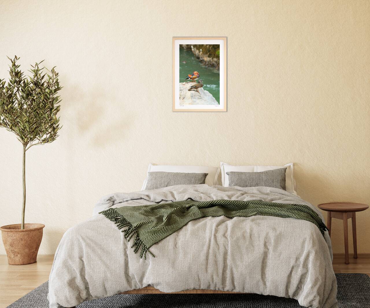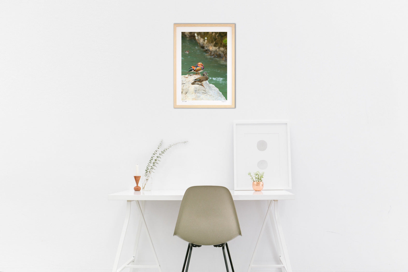 本当にいつも夫婦でいることが多いオシドリ、特にメス鳥の目の優しさに感動し、まるで夢に向かって若い夫婦が羽ばたこうとしているように思え、川に向かって飛びたつ前の静寂の一瞬をカメラにおさめました。
