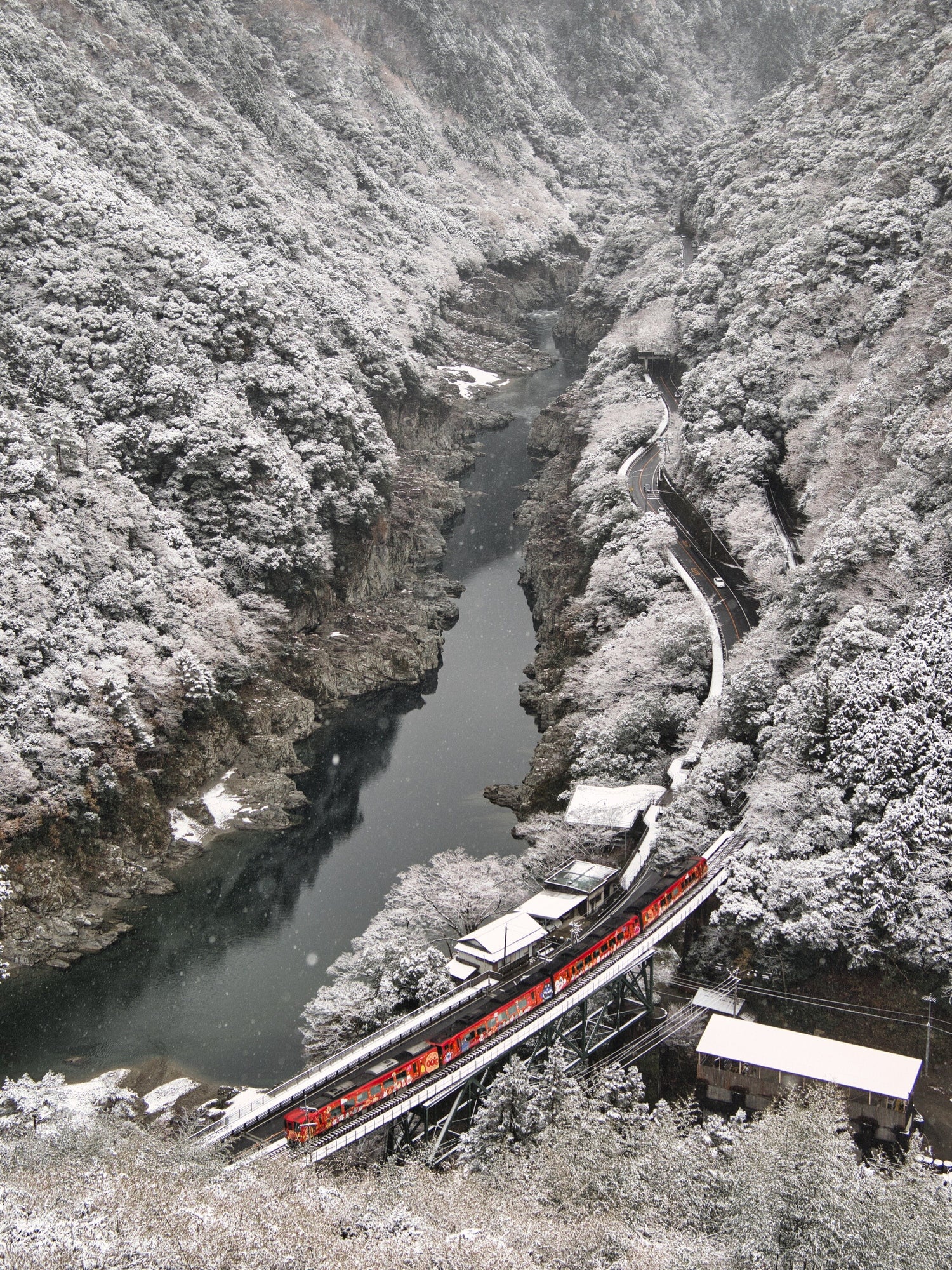 この日は雪が積もり、赤色のアンパンマン列車が走る姿は優雅です。