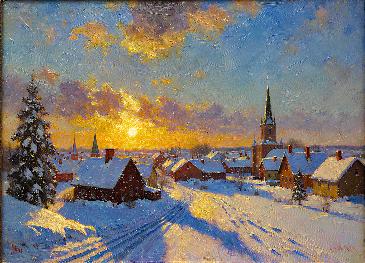 昇る太陽が、すべてを覆う深い雪に燦然たる黄金の光を投げかけ、白い世界が圧倒的な明るさで燃え上がり、きらめいているように見える。