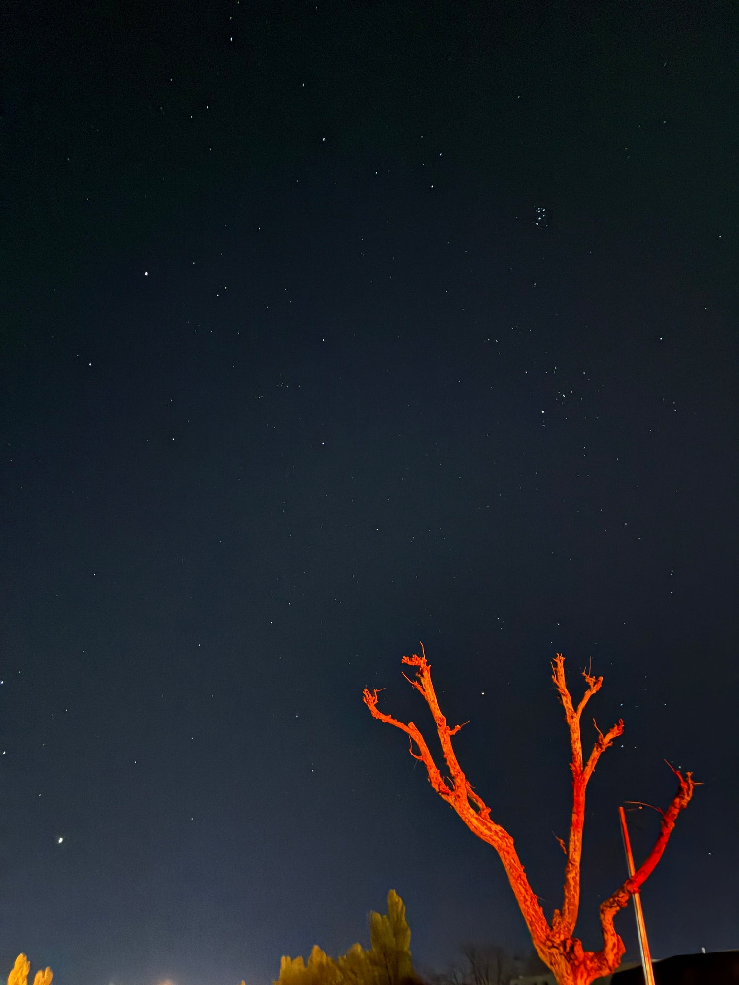 星に負けじと、交互に青と赤に輝くひとりぽっちのイルミネーション。