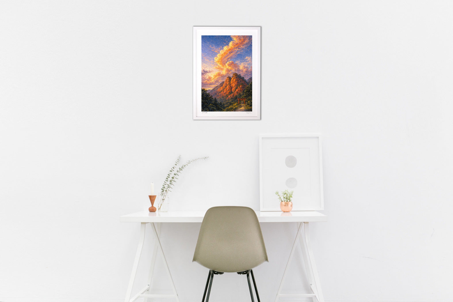 制作ではデジタル技術を取り入れつつ、構図・空気感・余白のバランスを重視し、絵画としての完成度を最優先に一枚ずつ丁寧に仕上げています。
