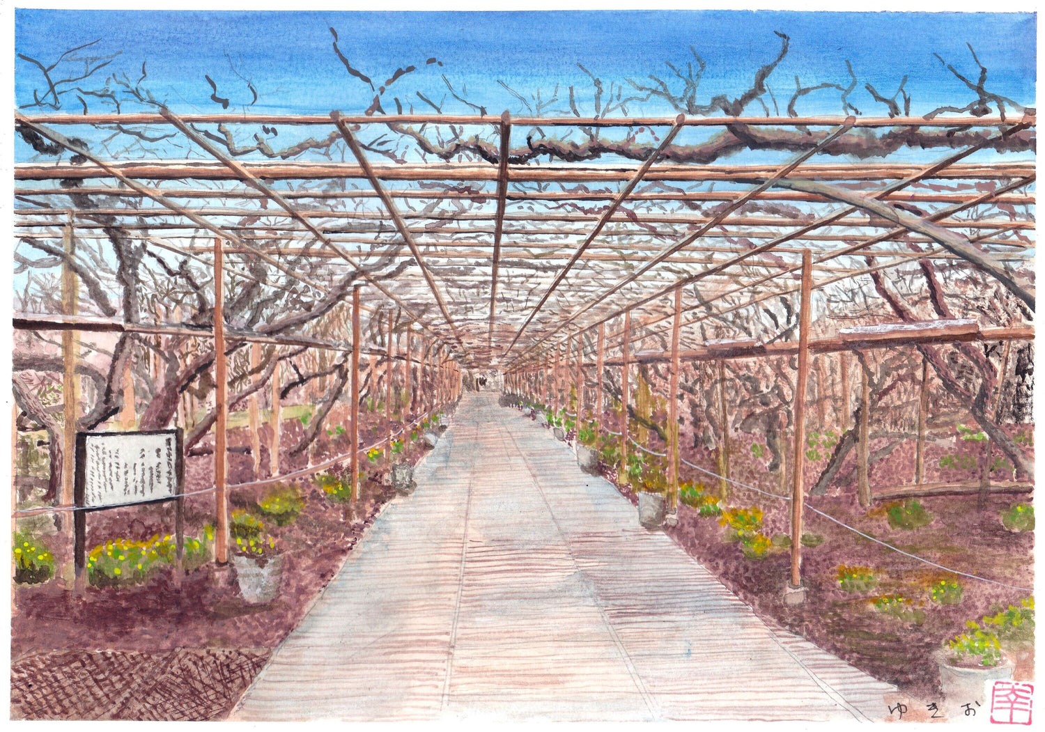 水彩画 季節はずれのあしかがフラワーパーク
