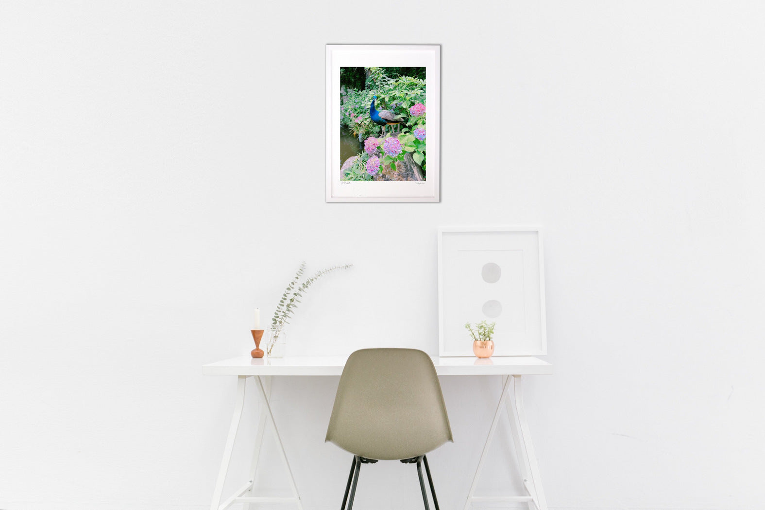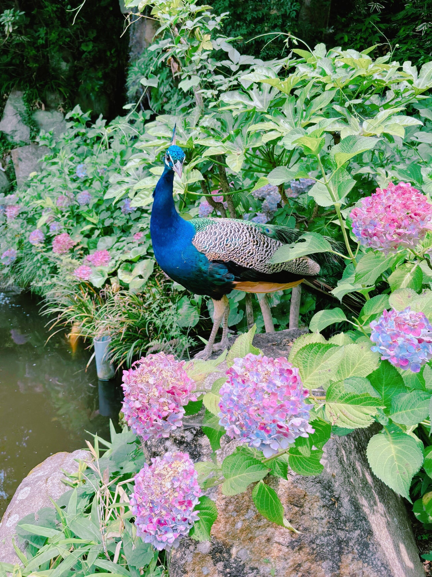 大好きな紫陽花を見に行った時に、紫陽花の中に孔雀を見つけて、とても自然に溶け込んでいる風景を見て、心を奪われました。