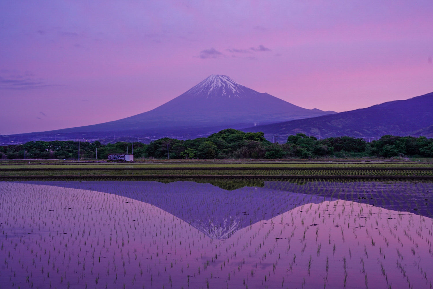 朝陽の昇る前の 1焼けの時間帯に 富士山を田植えの終わった水田を利用して 逆さ冨士を撮影しました