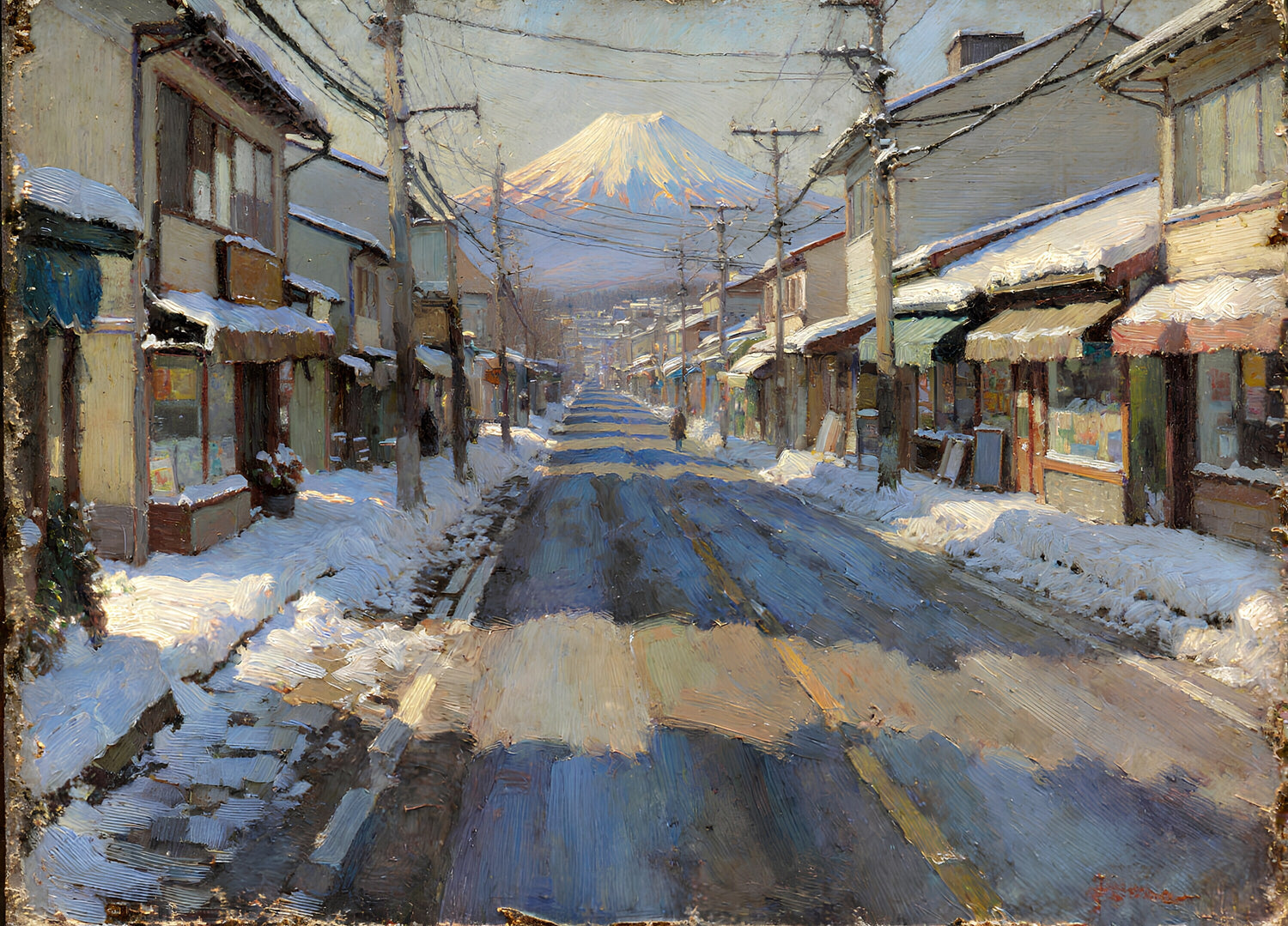 両側が商店街で歩道のある広い道路の先に富士山が見える。