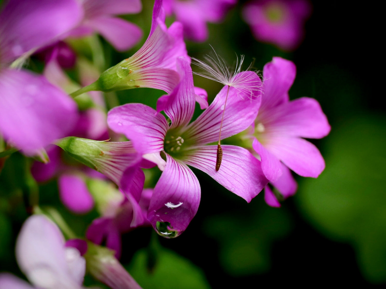 淡い紫の花びらと、その上の小さな雫。そしてたんぽぽの綿毛。