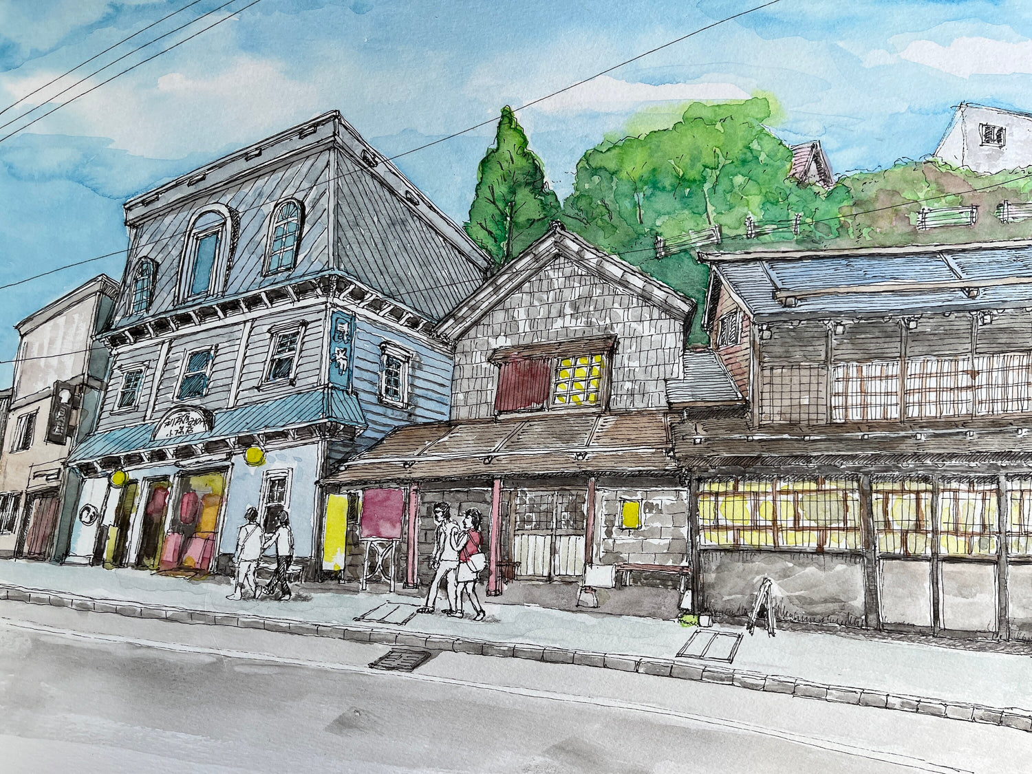 インバウンド観光客で賑わう小樽市内の商店街をスケッチしました。